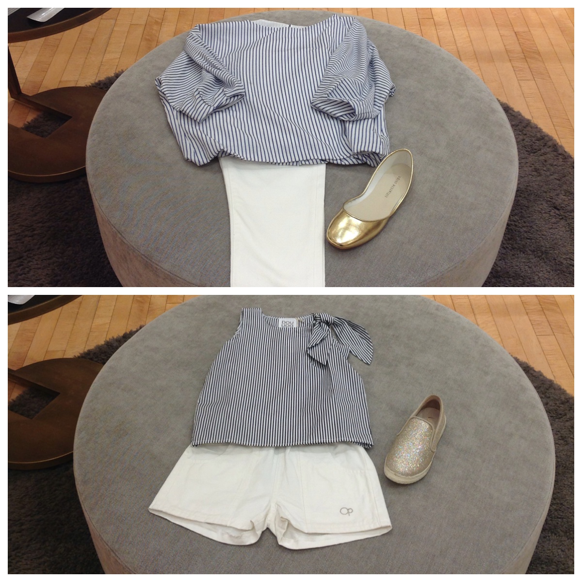 ママと私。でコーディネイト。 【MAMA】 シャツ:STRIPE GATHER BLOUSE ¥12,000(+TAX) DENIM PANTS¥12,000(+TAX) シューズ:METALIC FLAT SHOES¥15,000(+TAX) 【KIDS】 シャツ¥7,800(+TAX) パンツ:OCEAN PACIFIC SHORTS¥5,500(+TAX) シューズ:UNISA LAME SNEAKERS ¥9,800(+TAX)