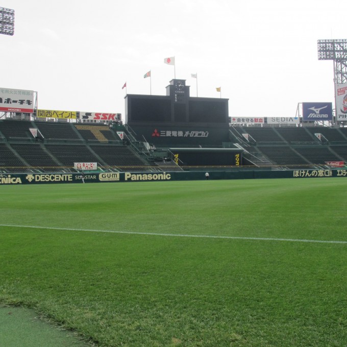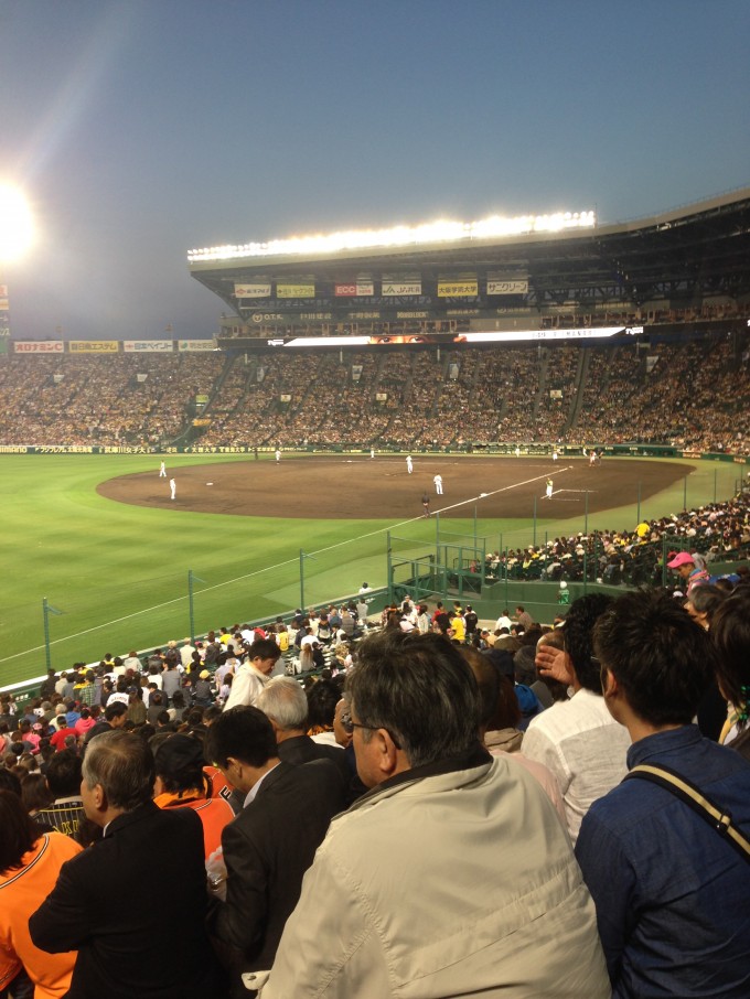 誰もいないグラウンドに応援もしてみました。 プロの選手や高校球児が流した汗や涙がしみこんだベンチは感慨深いものがあり、 物思いにふけってしまいました。 ところで試合はというと、伝統の巨人戦でした。