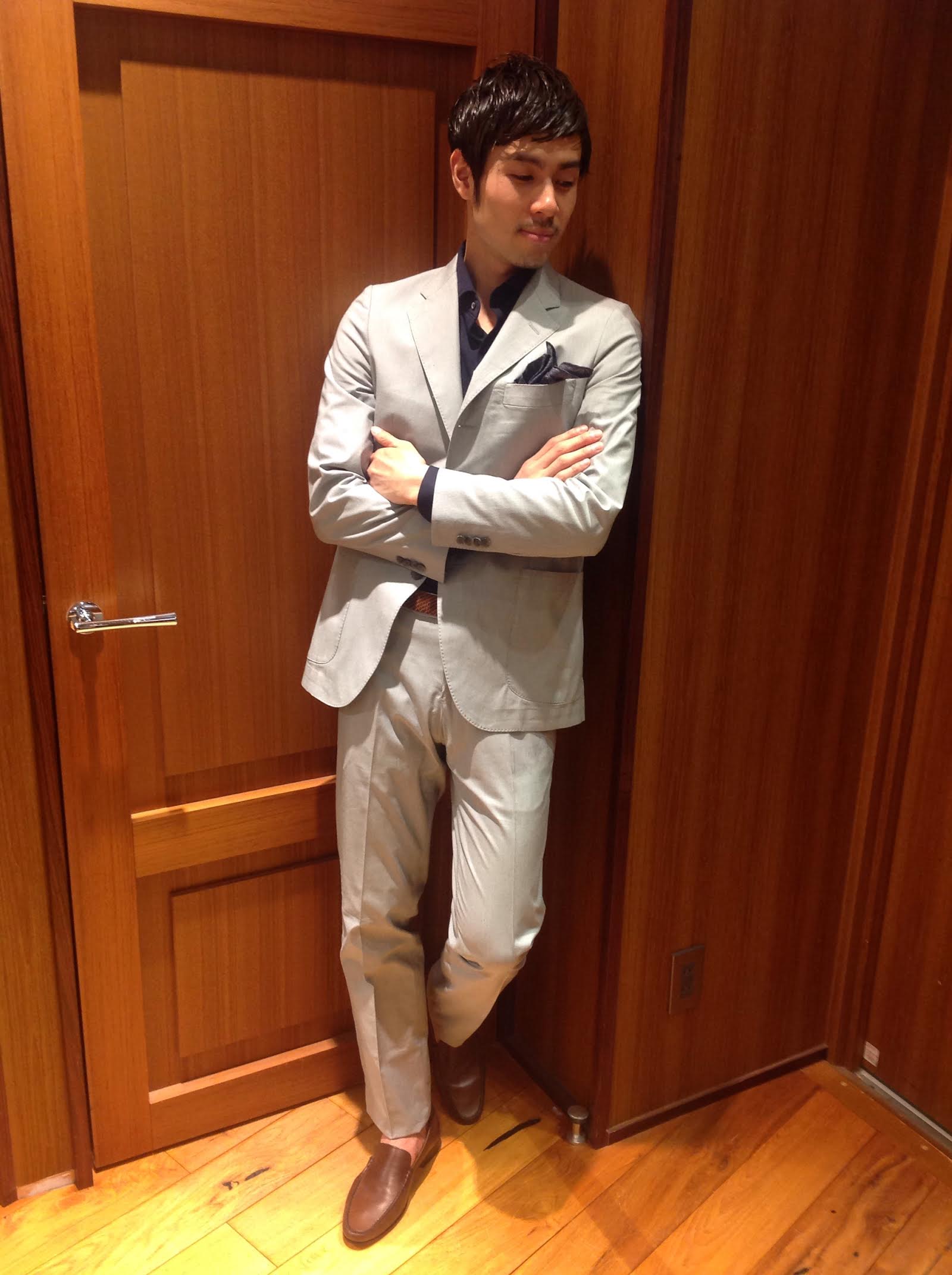 ライトグレーにネイビーのシャツ、足元はブラウンのローファー。 ジャケットは伸縮性があり細身ですが楽な着心地です。