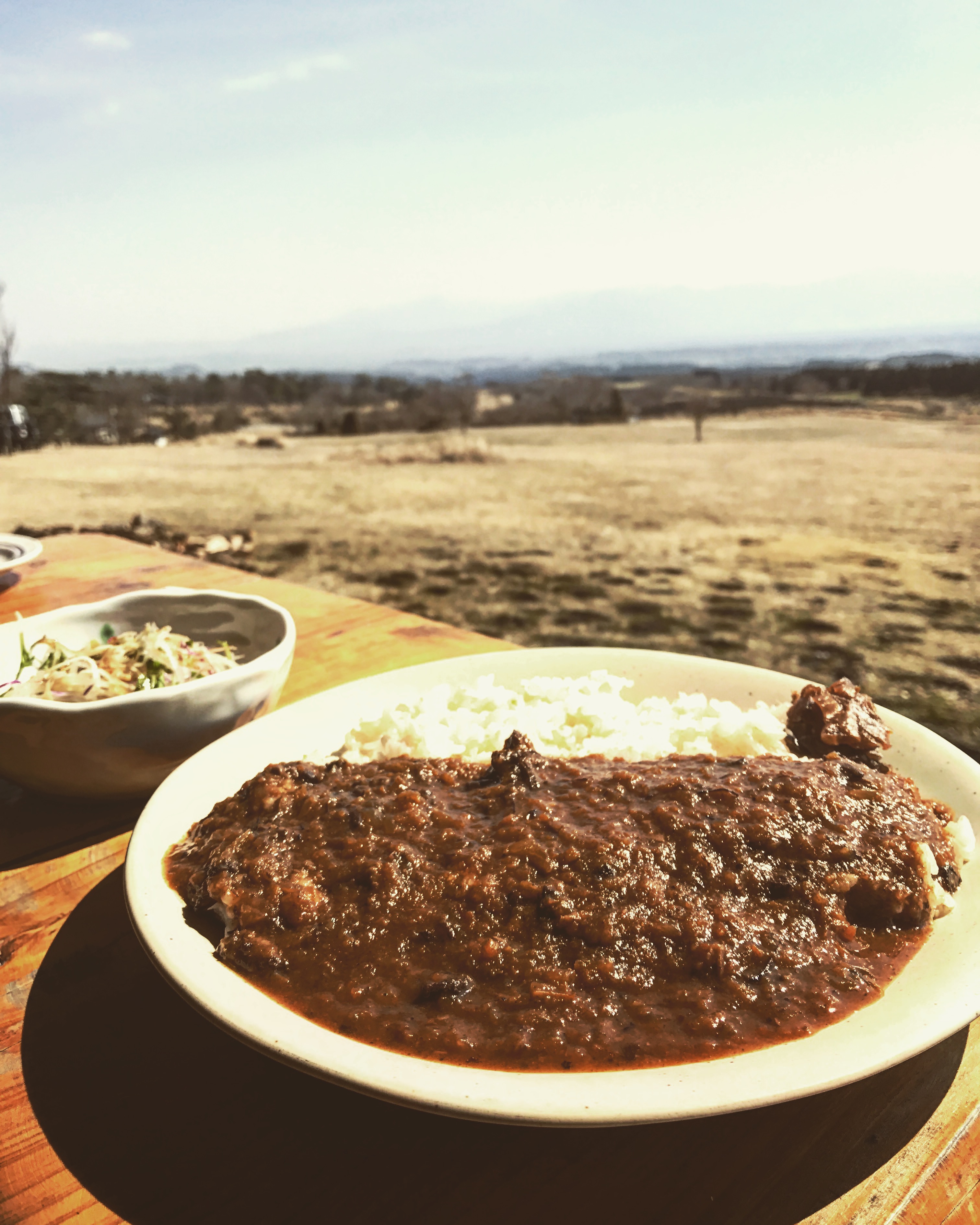 九重の山脈を見ながら食べるこのカレーが