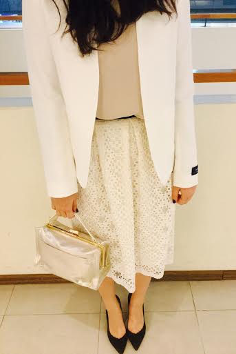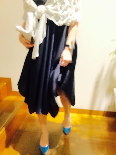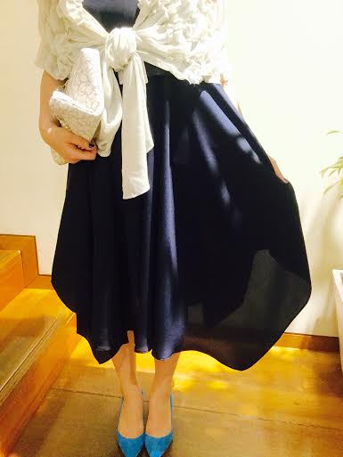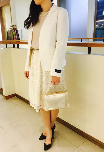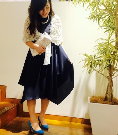 ストールやパンプス、ネックレスで華やかさを出しました。