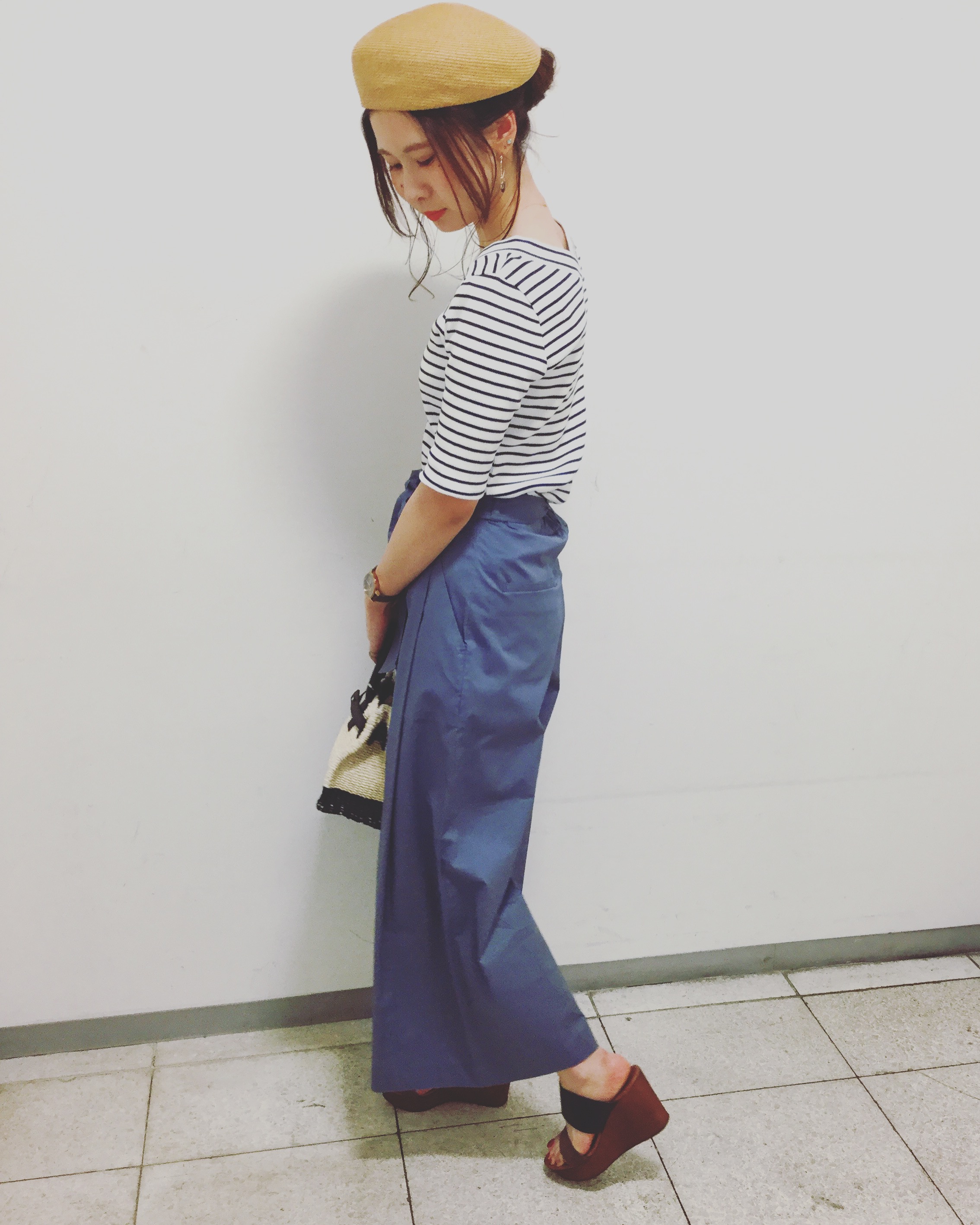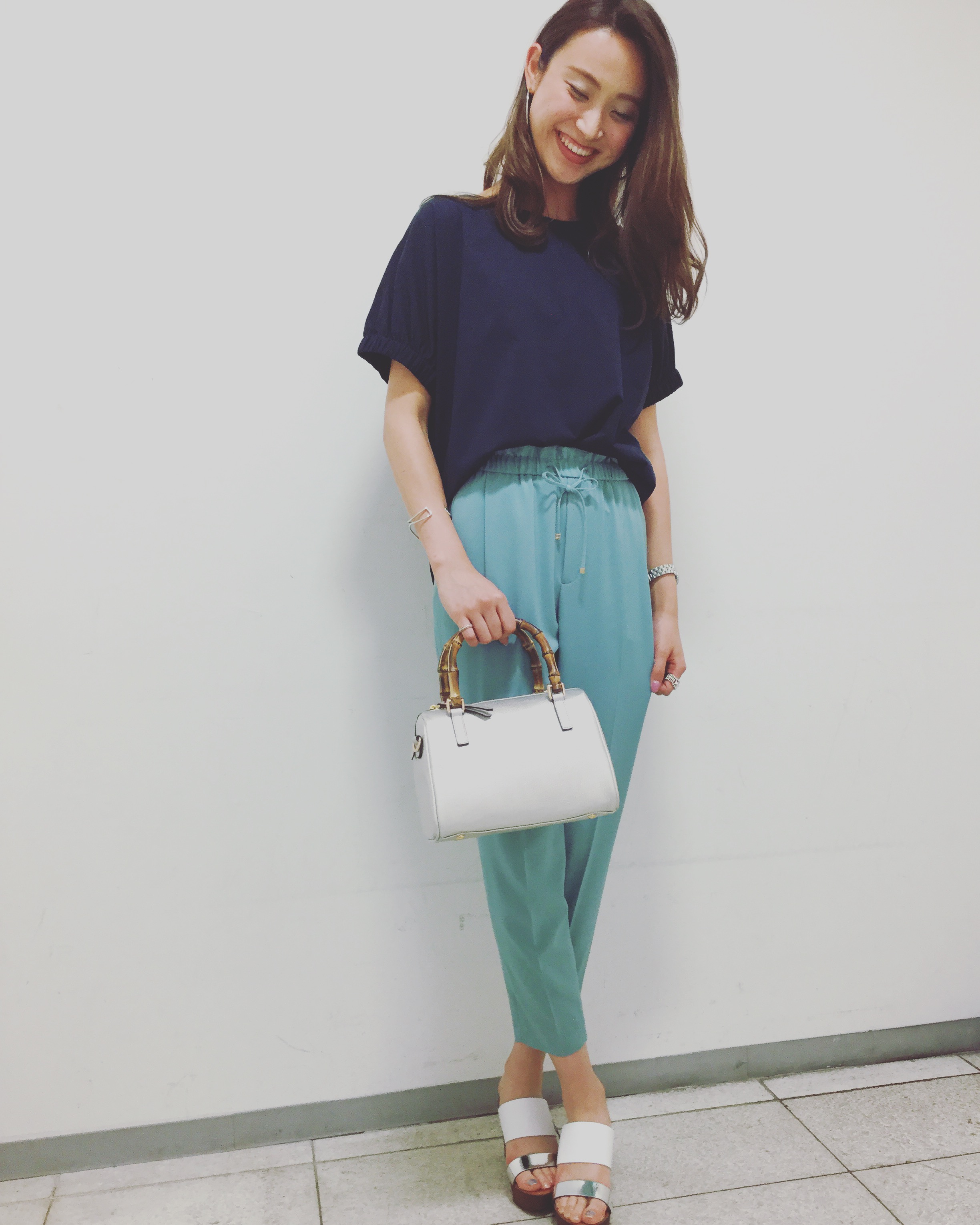 鮮やかなブルーが目を引くパンツを使ったコーディネート。