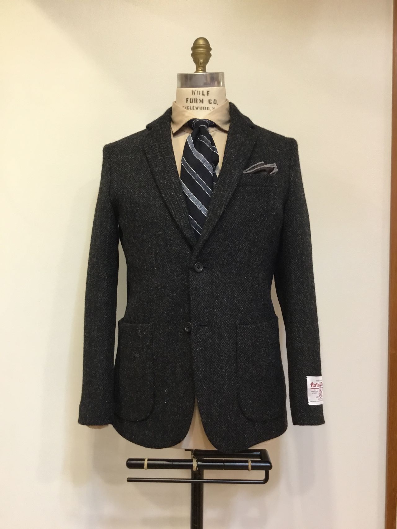 柄はヘリンボーンの王道でチェンジポケット、サイドベンツといったディティール。
