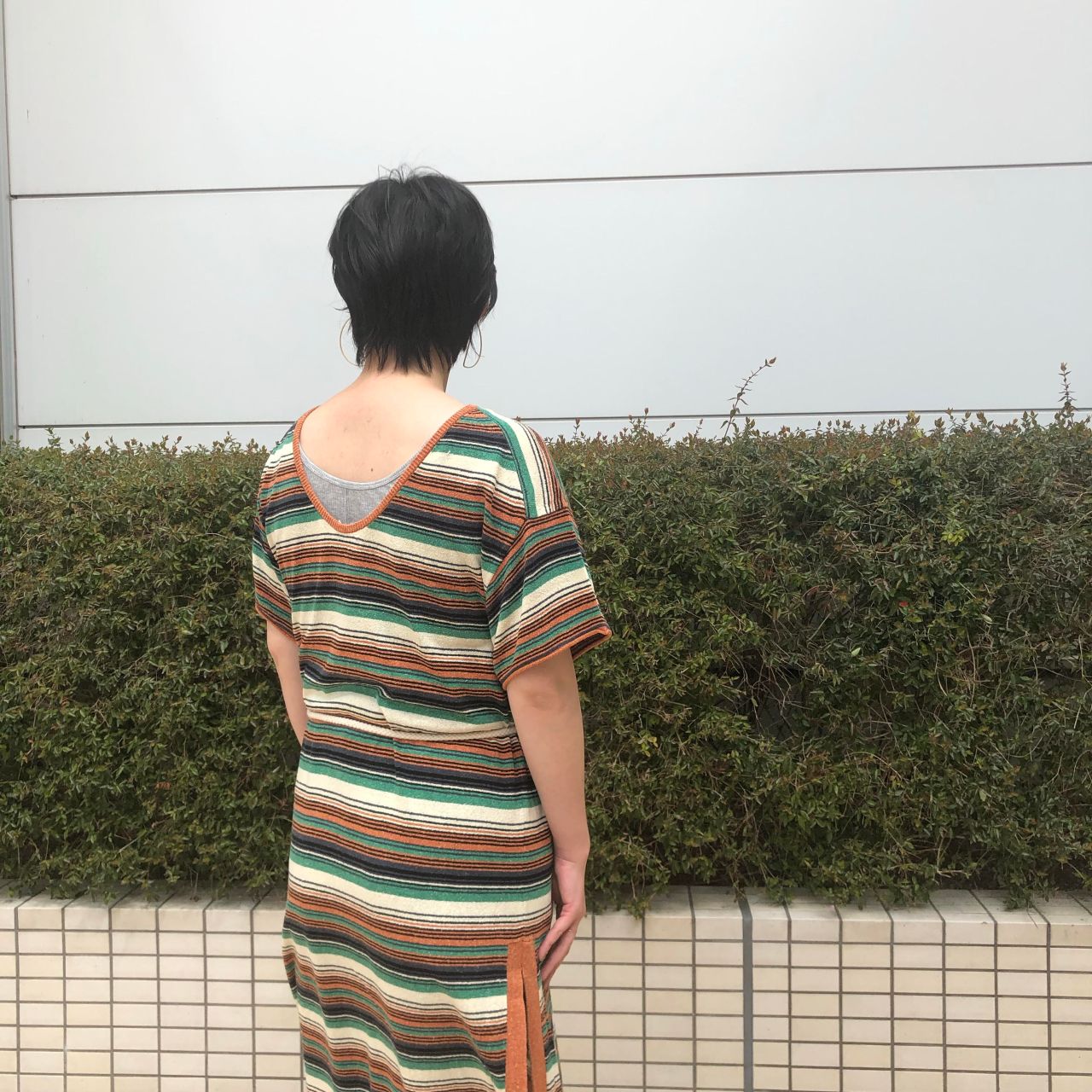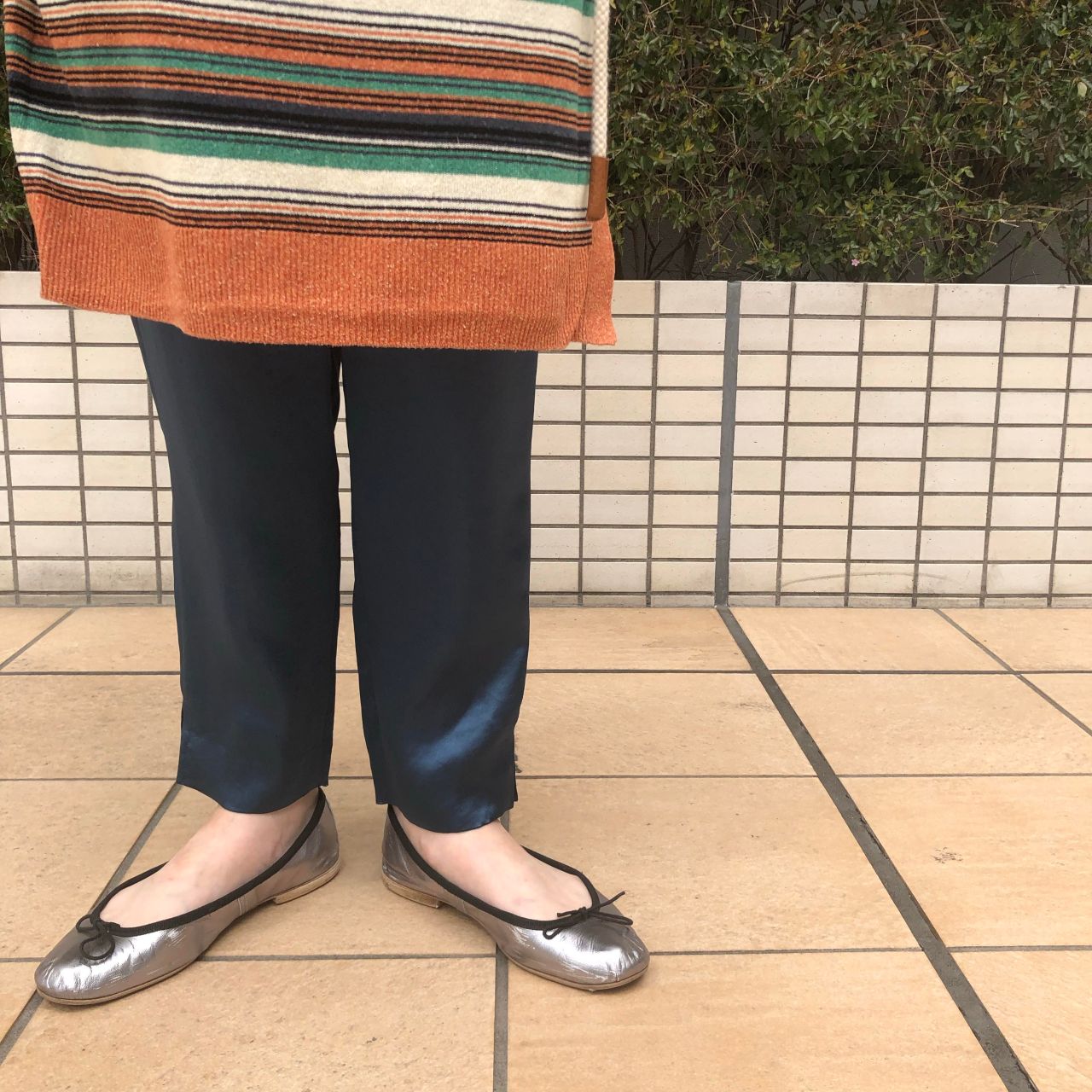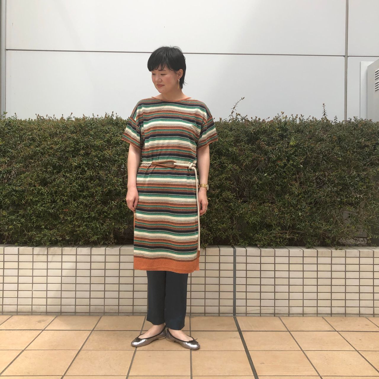 お次はマルチボーダーの柄がポイントのワンピースに、履き心地抜群なサテン地のパンツを合わせました。