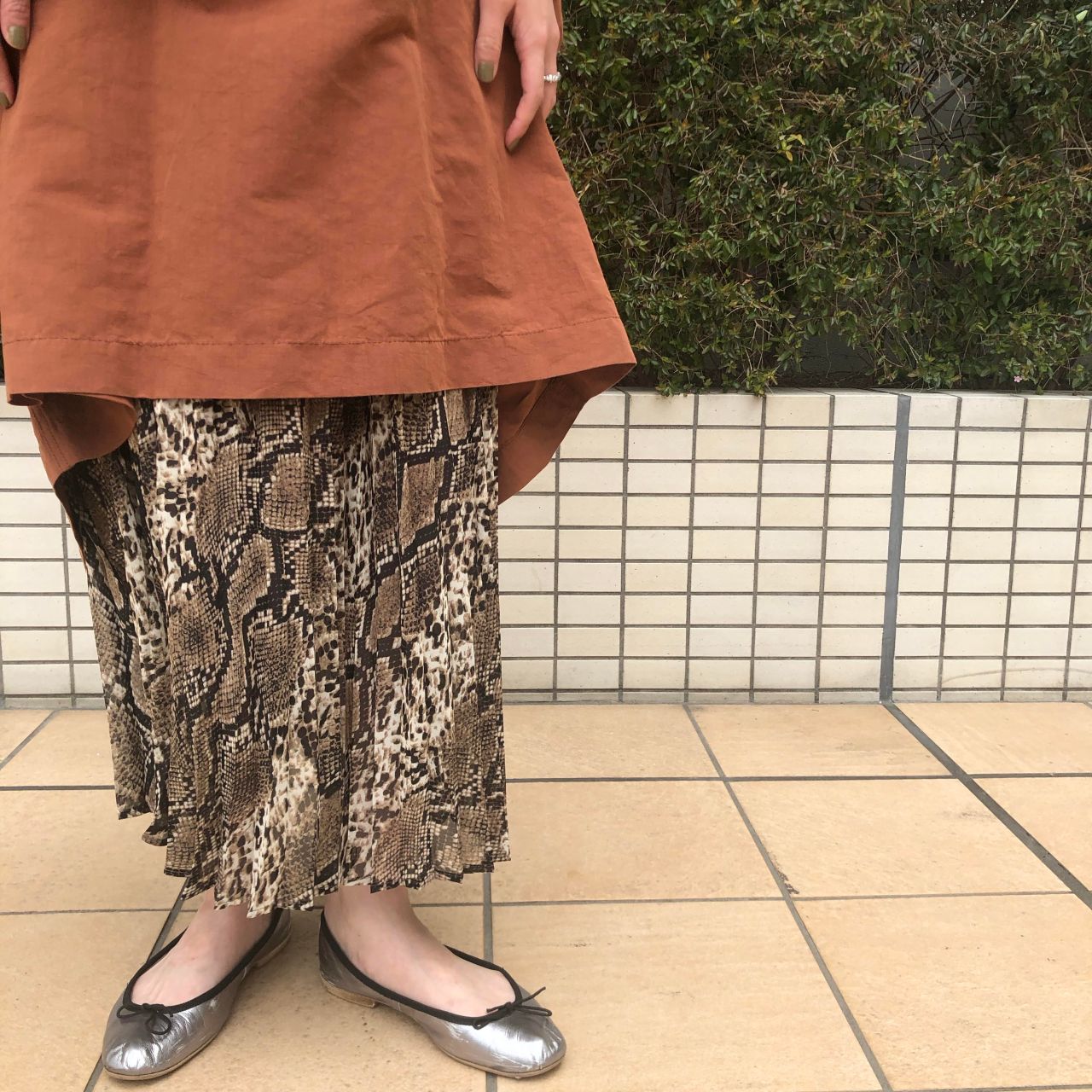 涼しげなリネンコットン素材のワンピースにトレンドのパイソン柄のスカートを
