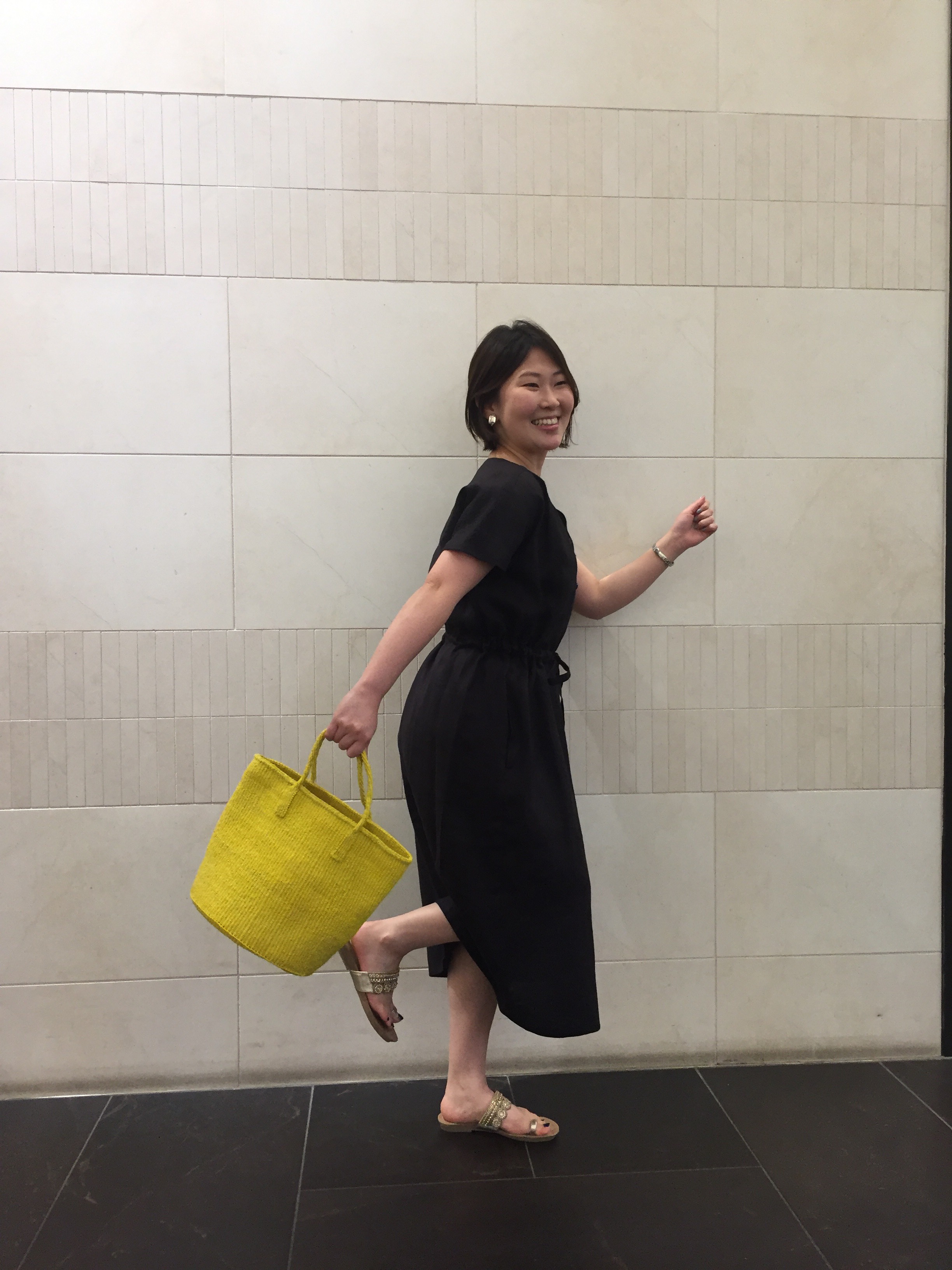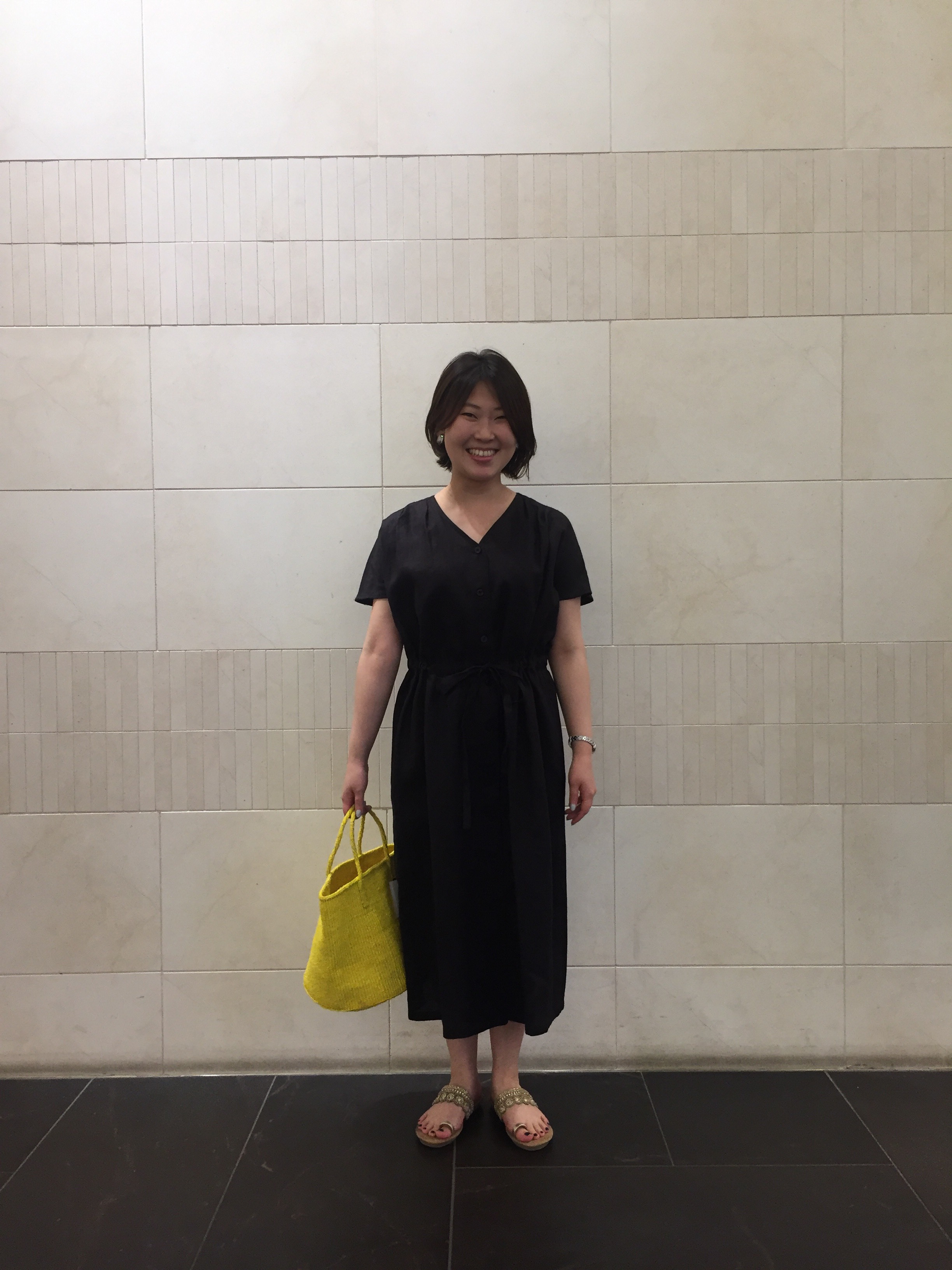 「女性らしさが詰まっているといったらやっぱりワンピースです! デートにもぴったりなエレガントさもあり、麻100%なので落ち着いた色味も 重たい印象になりません☆黒で一段と大人っぽくレディに☆ 足元もキラッと上品さをプラスしました。でも!ペタンコサンダルなので 歩きやすく疲れにくいところもポイントです!」 IMG_0969