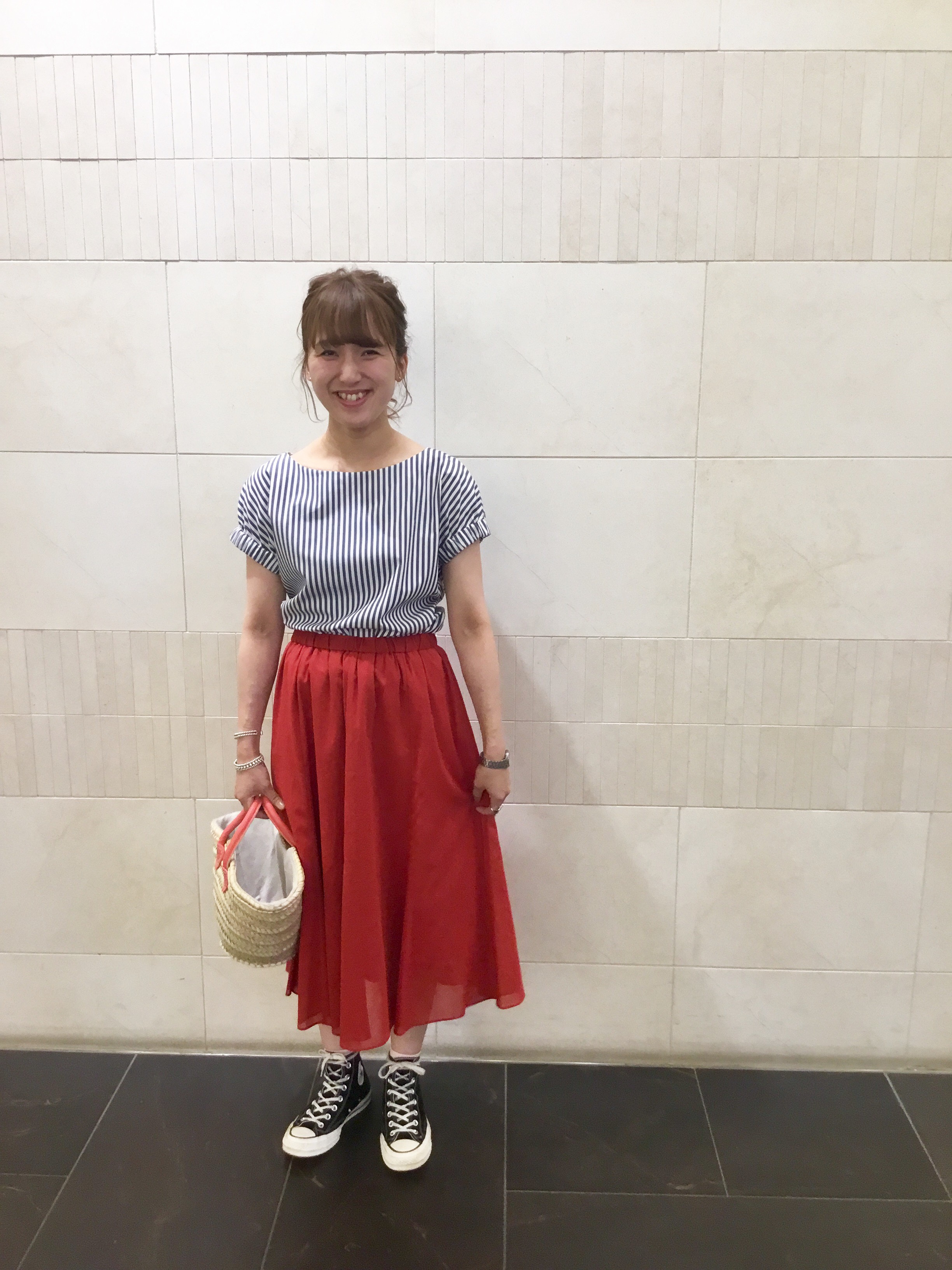「梅雨のじめじめも吹き飛ばしてしまうくらいのパキッとした鮮やかな赤は見ているだけで元気が湧いてきます☆ こちらのスカートはふんわりシルエットで落ち着きもあり女性らしさも兼ね備えた1枚です。 ブルーのストライプとコンバースで合わせ元気いっぱいのコーディネートにしてみました!」