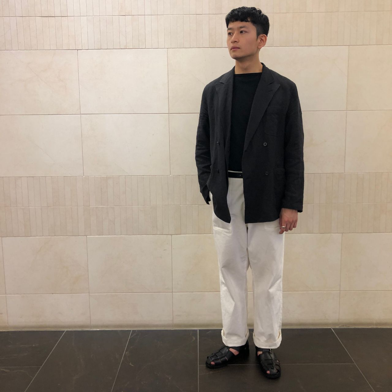 麻素材のジャケットに白パンツと、初夏の大人っぽい装いにもマッチします。