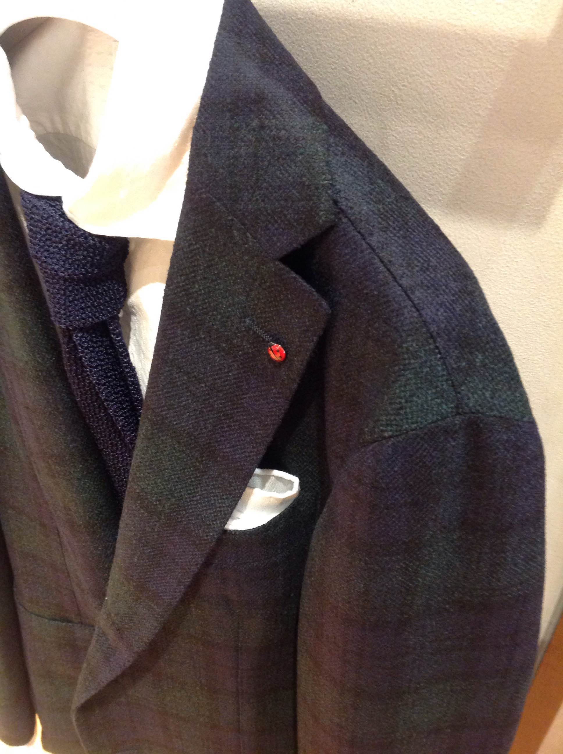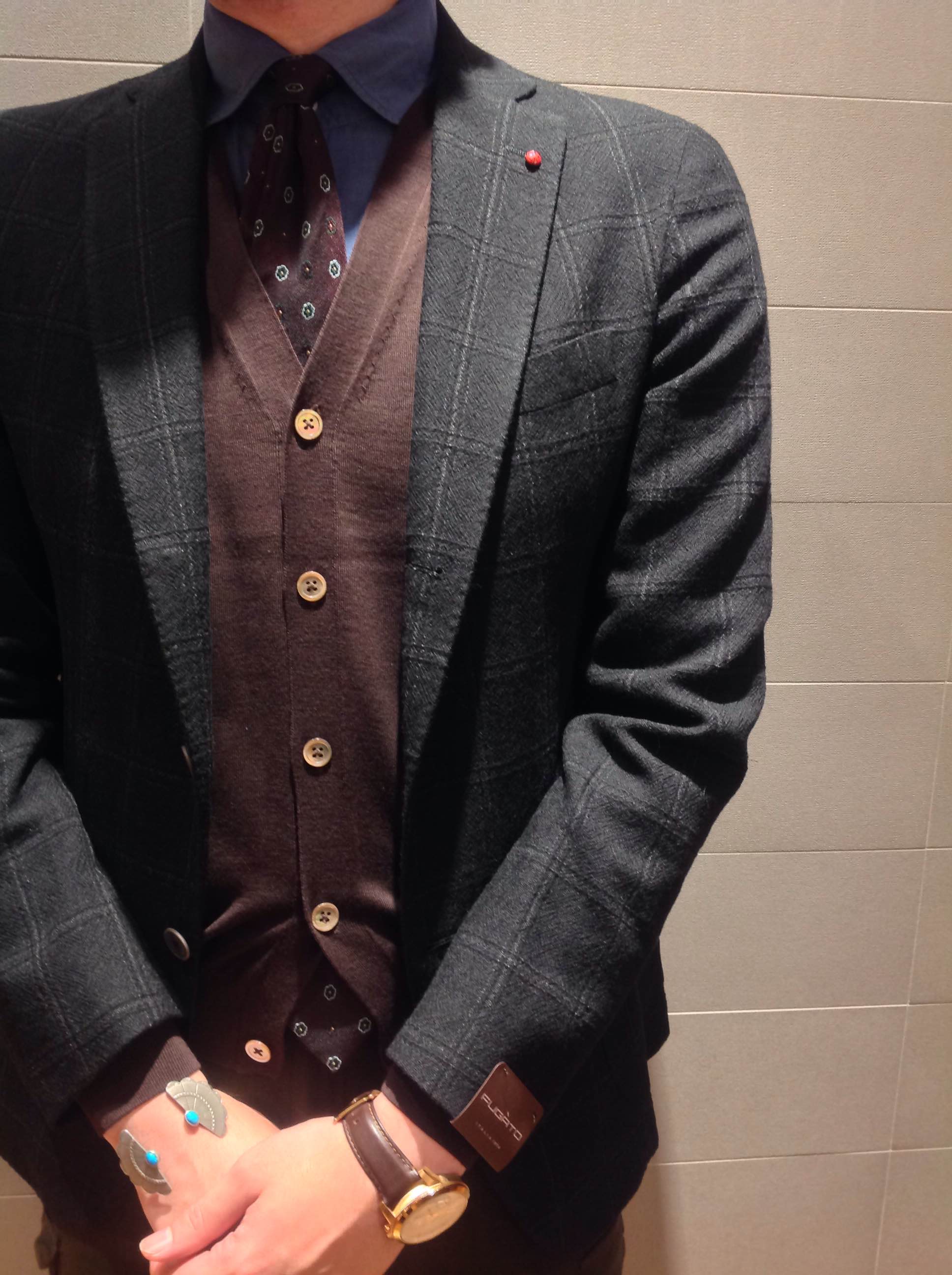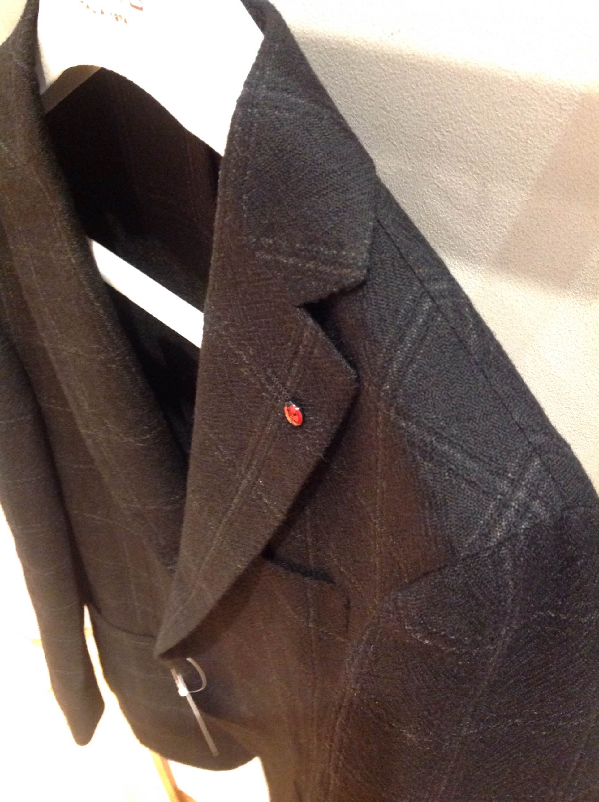 こちらは荒めのピンヘッドのような生地。風合い豊かで、色柄も落ち着いていますので、様々な方がお似合いになるのではないでしょうか。非常に合わせやすそうでもあります。