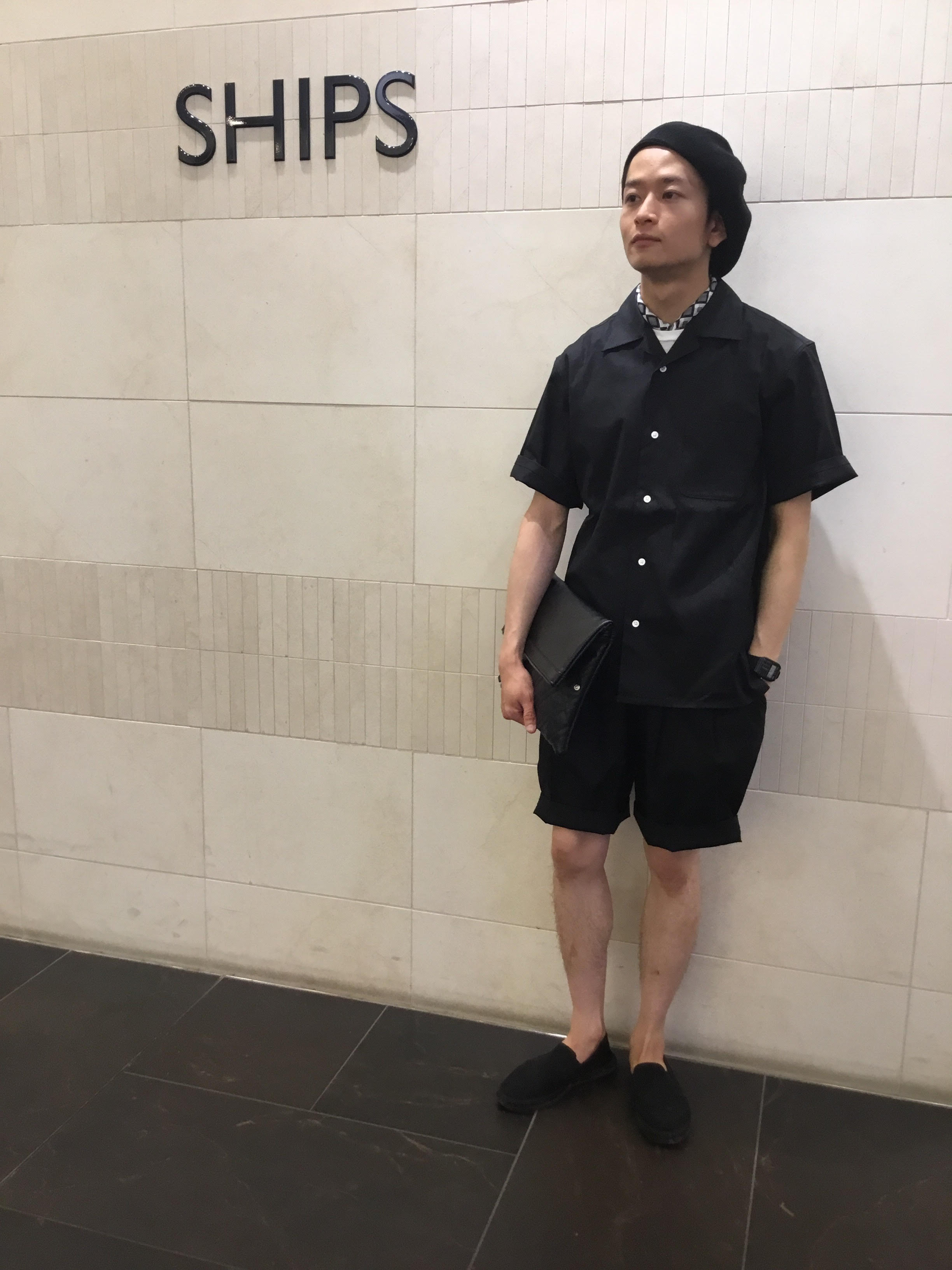 シャツ コットンリネンツイル オープンカラーシャツ 121-52-0072 ¥11,000(+TAX) ショーツ コットンリネンツイル ワイドショーツ 123-32-0057 ¥9,000(+TAX) シューズ SALVI フェイクスエード エスパドリーユ 125-00-0013 ¥5,900(+TAX) 帽子 リネンベレー 128-50-0041 ¥5,000(+TAX)   黒のトップスに、黒のボトムス、黒の帽子、黒の靴、黒の腕時計、黒の…。 と、なにから何まで真っ黒!!   普通に考えれば暑苦しい事、この上ないコーディネートの筈ですが 要所のポイントを押さえて『清涼感』と『小洒落感』を出すことに成功しております!   まずは、トップスに開襟シャツ、ボトムスにショーツを合わせて、腕と足を出すことで見た目にも涼しい印象をGET!! 3