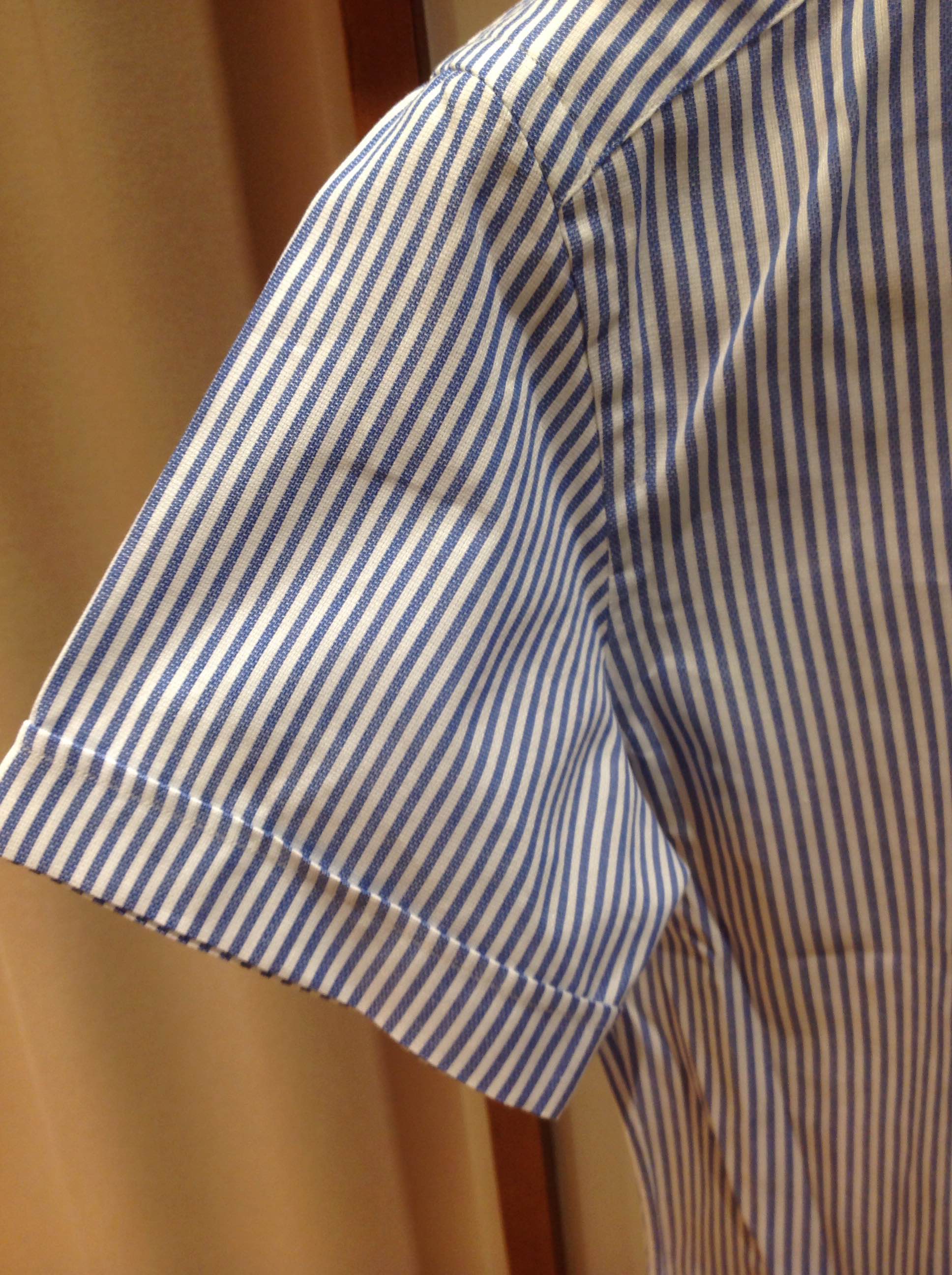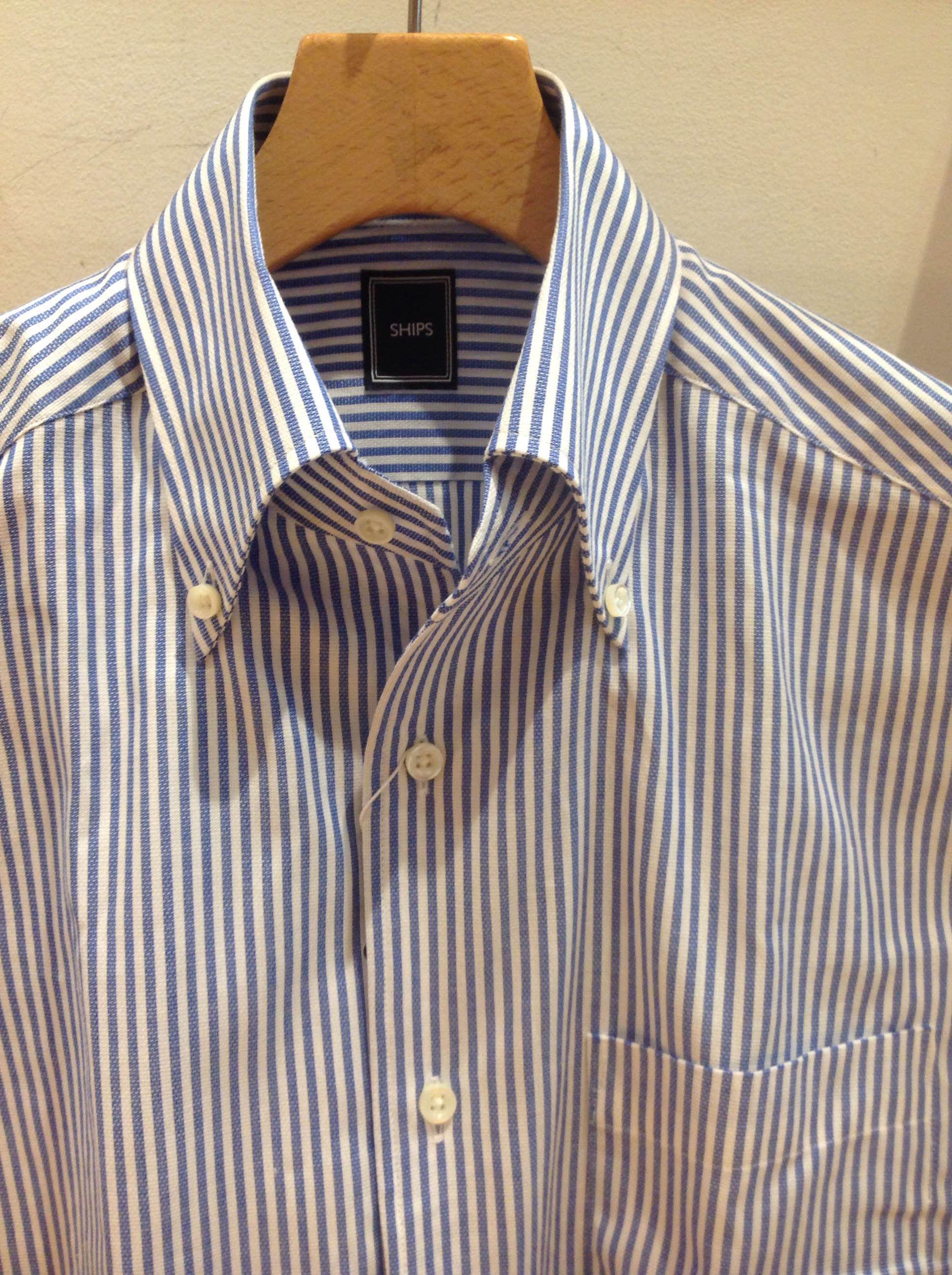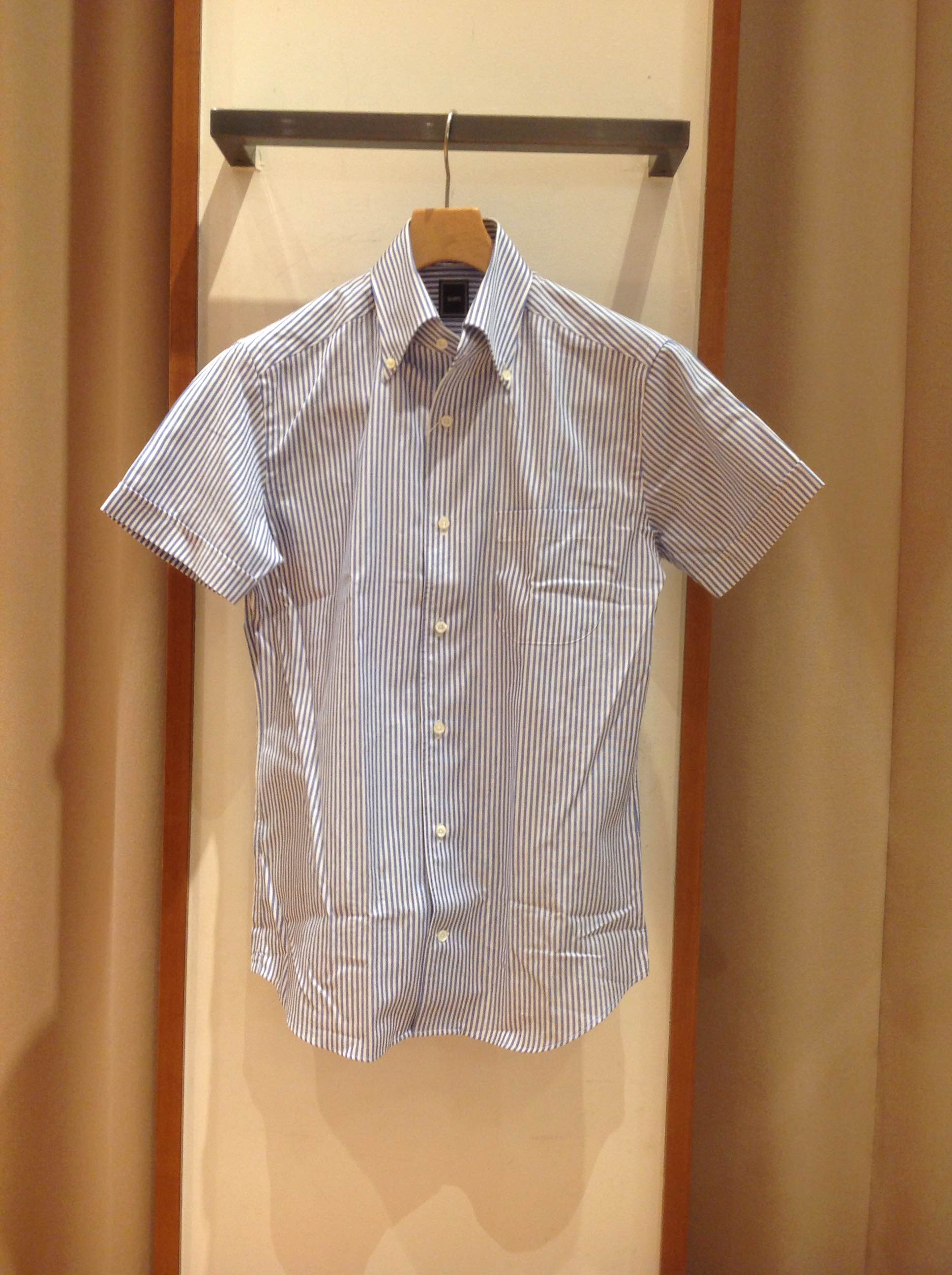 襟型はボタンダウンを採用。第1ボタンと、第2ボタンの間隔が通常のシャツよりも開いていますので、クールビズ向きです。開放的過ぎない絶妙な間隔ですので、ビジネスシーンメインでご利用頂けます。 胸ポケットもついてますよ!