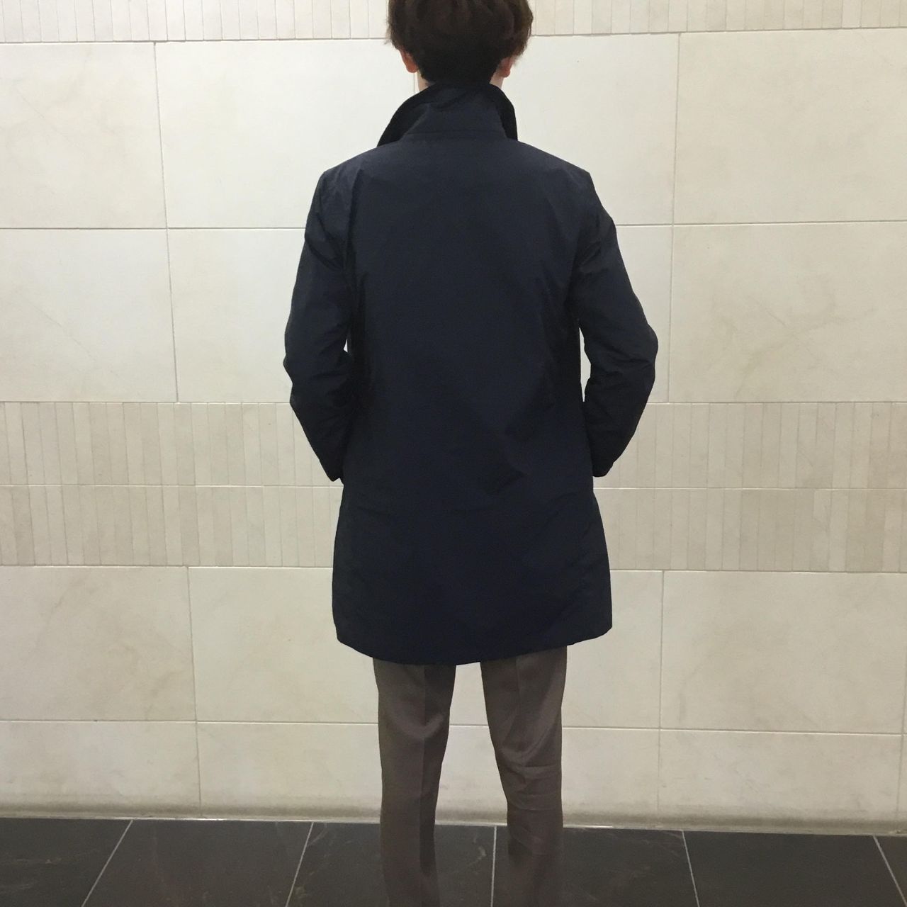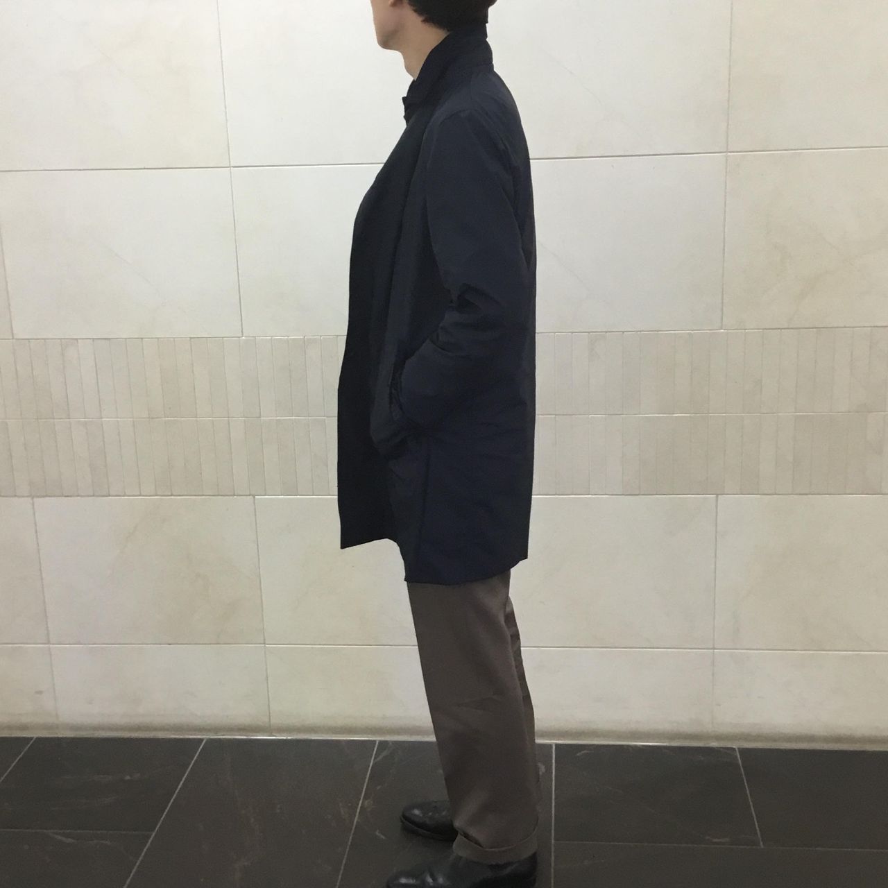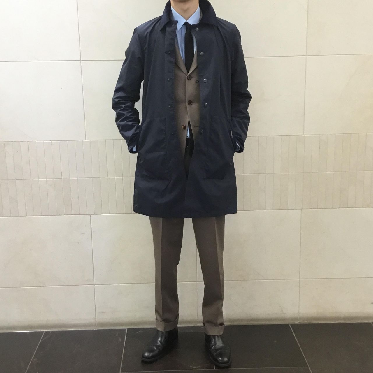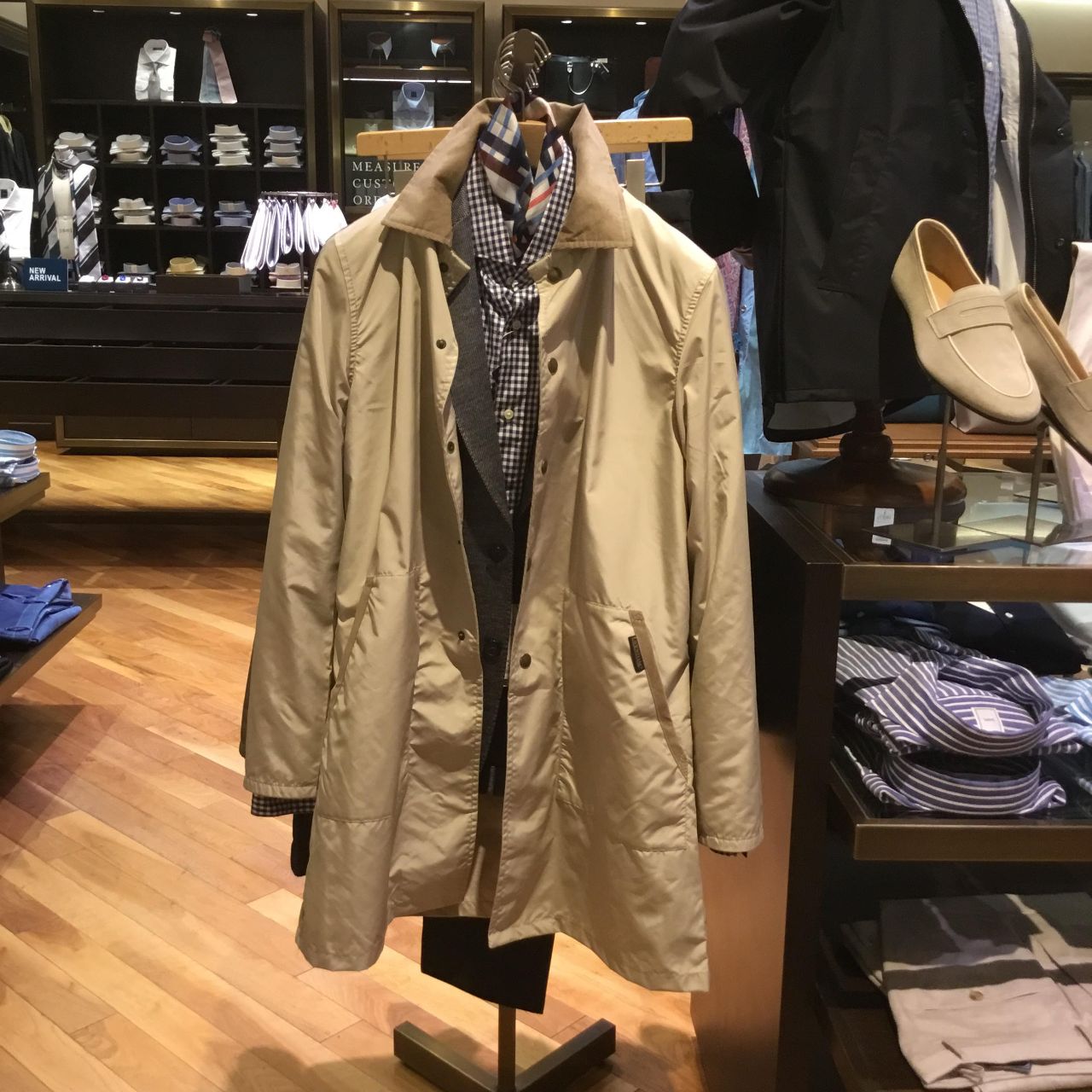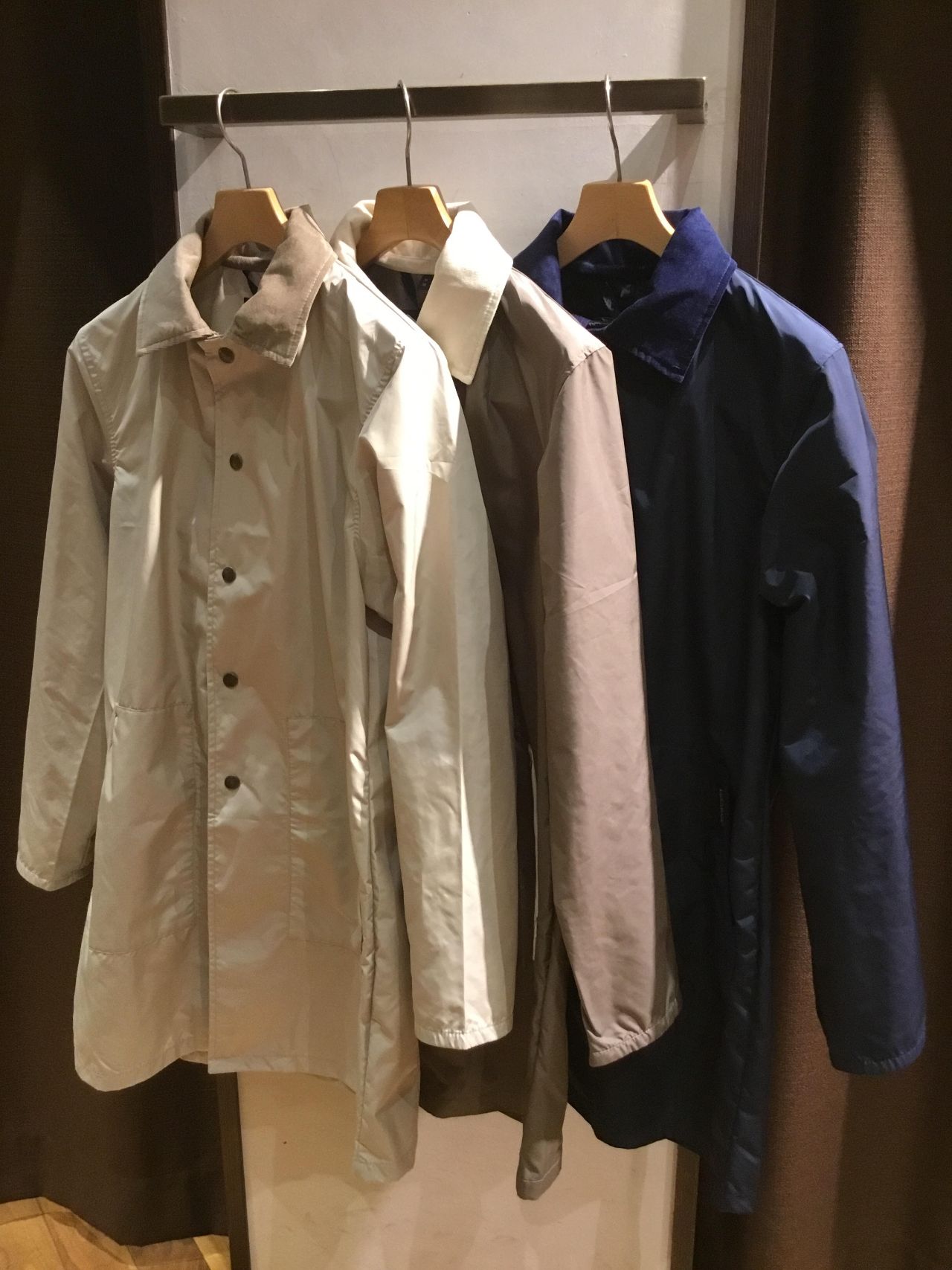 SHIPSの完全別注型で、ビジネスマンに向けて作成したミドルレングス丈のステンカラーモデル。