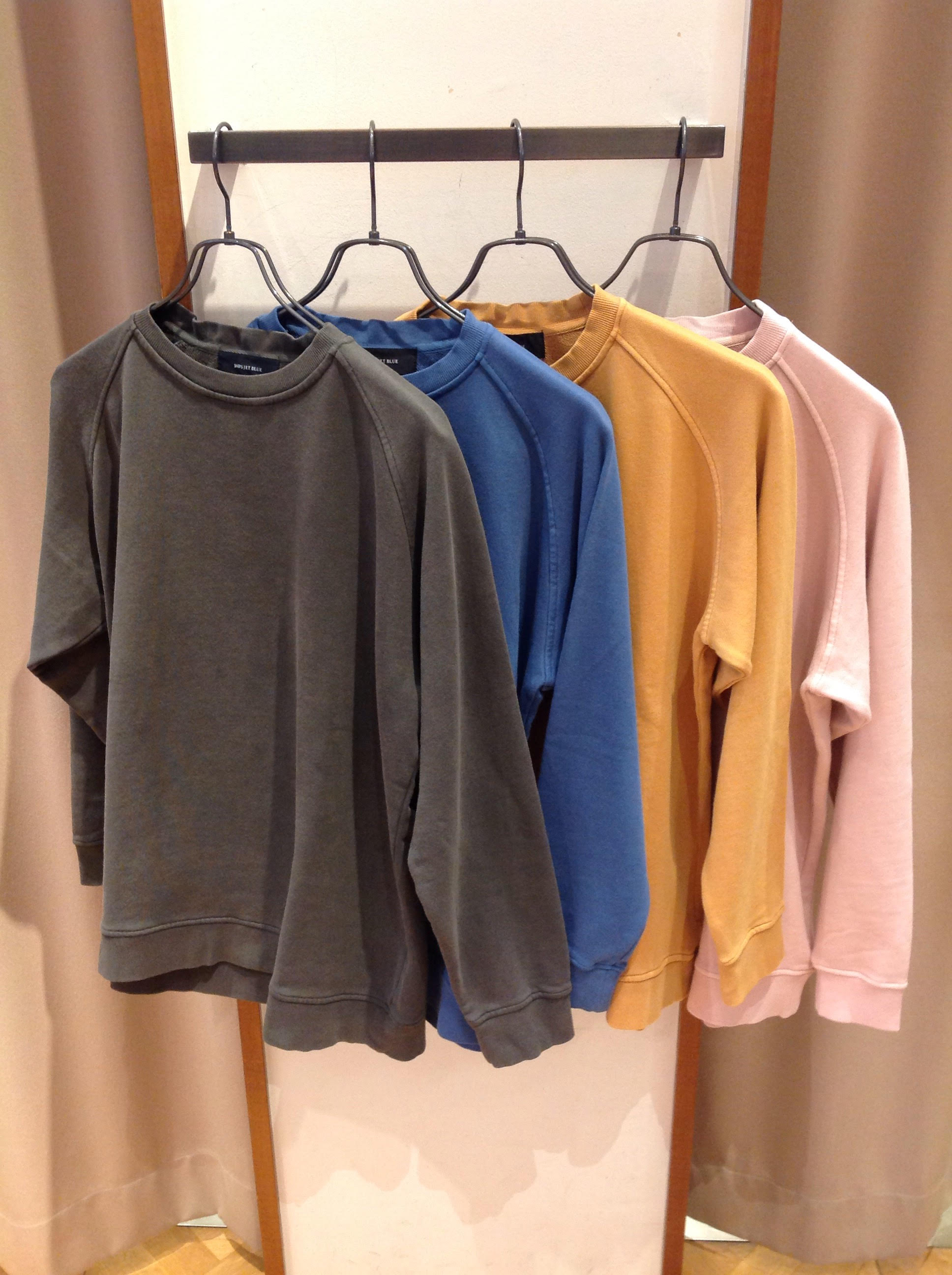 商品名:ジェットブルー/オーバーダイ スウェット 品番:122-00-0146 価格:7,800+税 今時期はつい白、黒、グレーなどのモノトーンスタイルになりがちですよね。 そんな時にコーディネートの差し色として使いやすいカラーが揃っています! 商品名にもあるオーバーダイとは「後染め」のことなのですが 製品の形を作ってから染めているので、色が「少しかすれた古着っぽい色」に仕上がります! 男性だと特に、ピンクやイエローをコーディネートに取り入れるのに抵抗がある方も多いと思うのですが、この褪せた感じのカラーであれば違和感無く使えそうですね! 早速コーディネートに取り入れてみました!