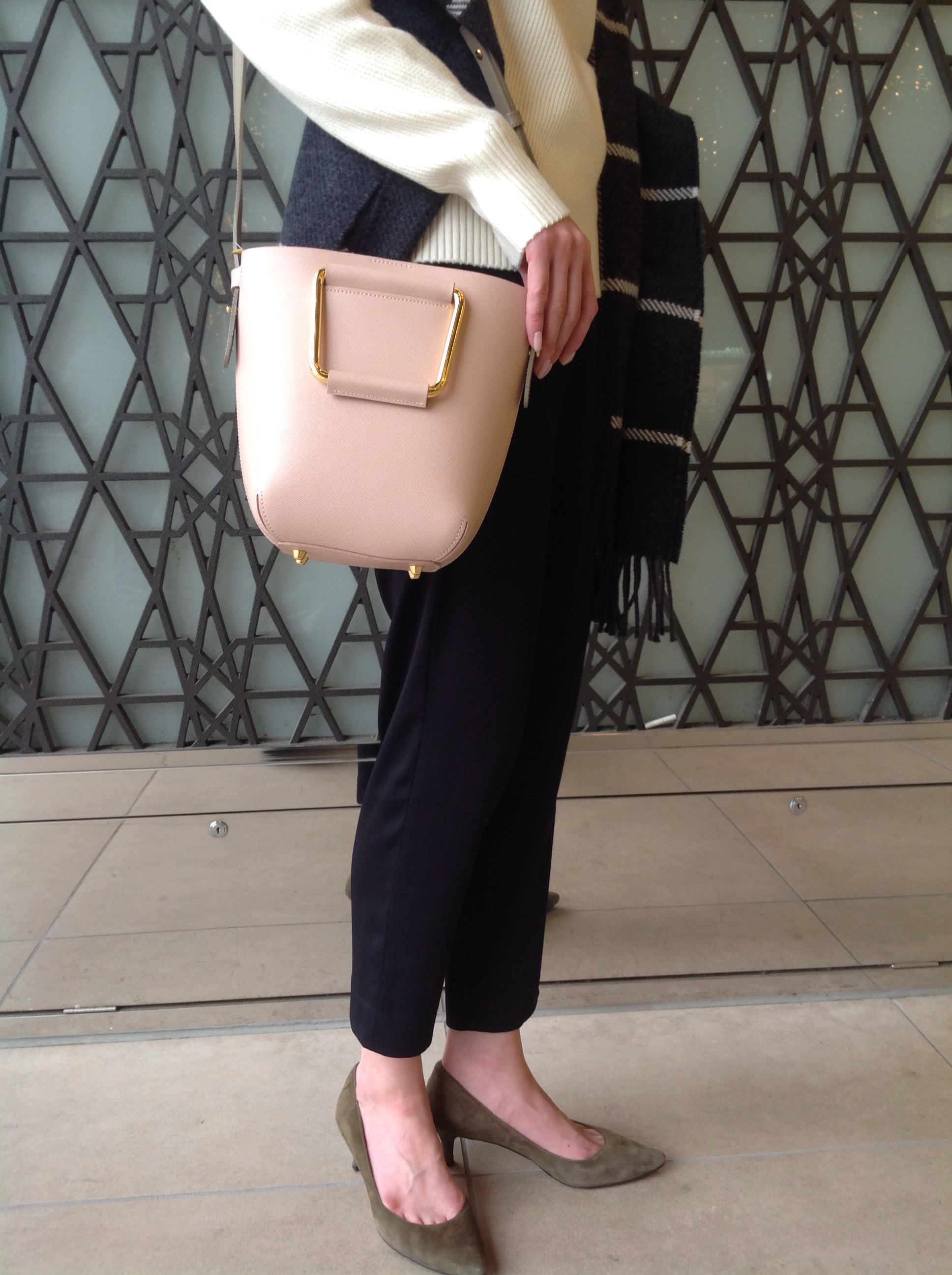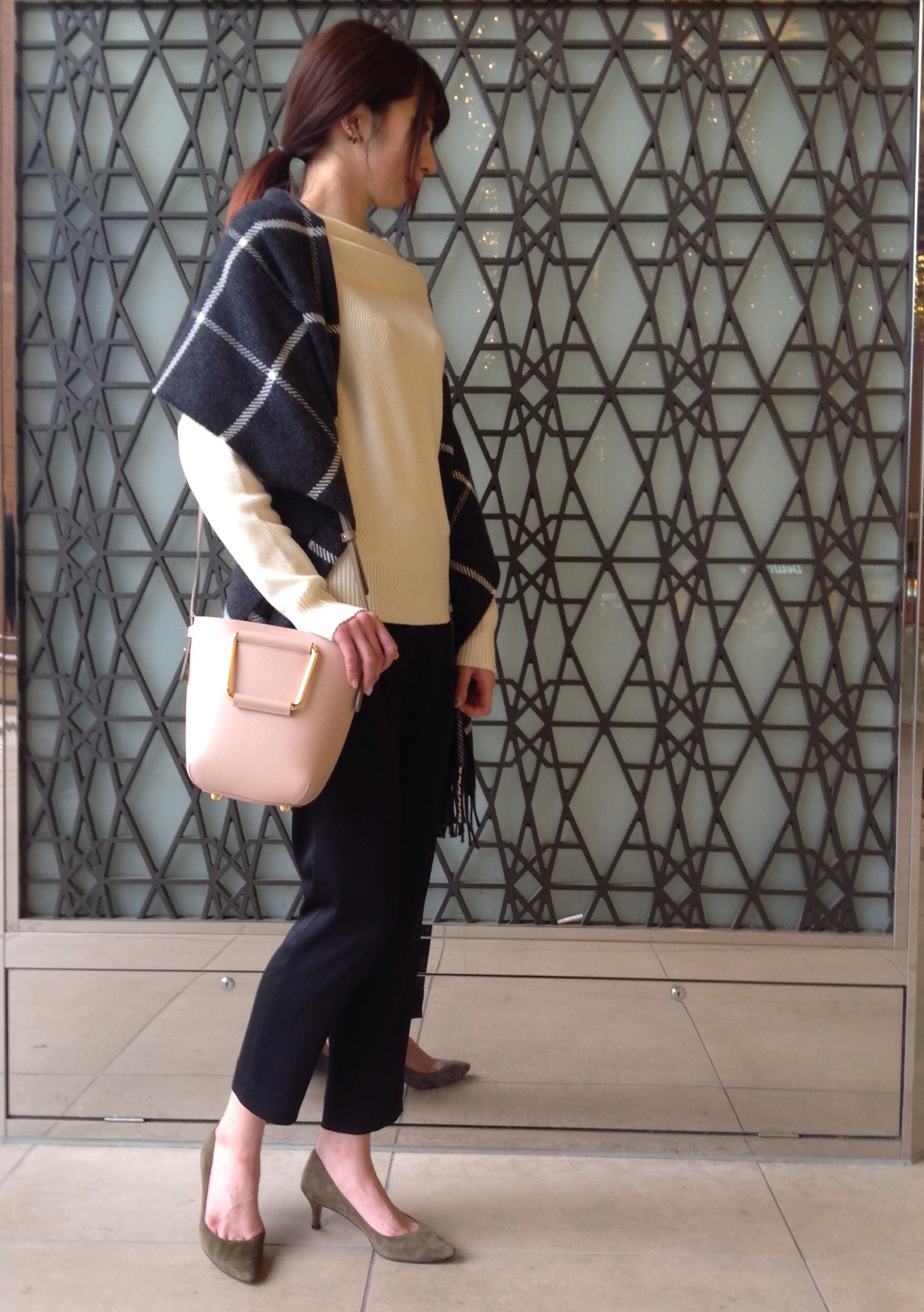 TOPS: WC:BOTTLE/N YOKORIB POV ¥12,000-(+TAX) 316-06-0140 PANTS: WD:HEAVY SATIN TUCK PT ¥13,800-(+TAX) 313-16-0059 STOLE: BEGG:W/PEN STOLE ¥27,500-(+TAX) 318-24-0153 ハンドルバッグは、ハンドルを持つことはもちろん、 付属のストラップでショルダーバッグとしてもお使い頂けます。