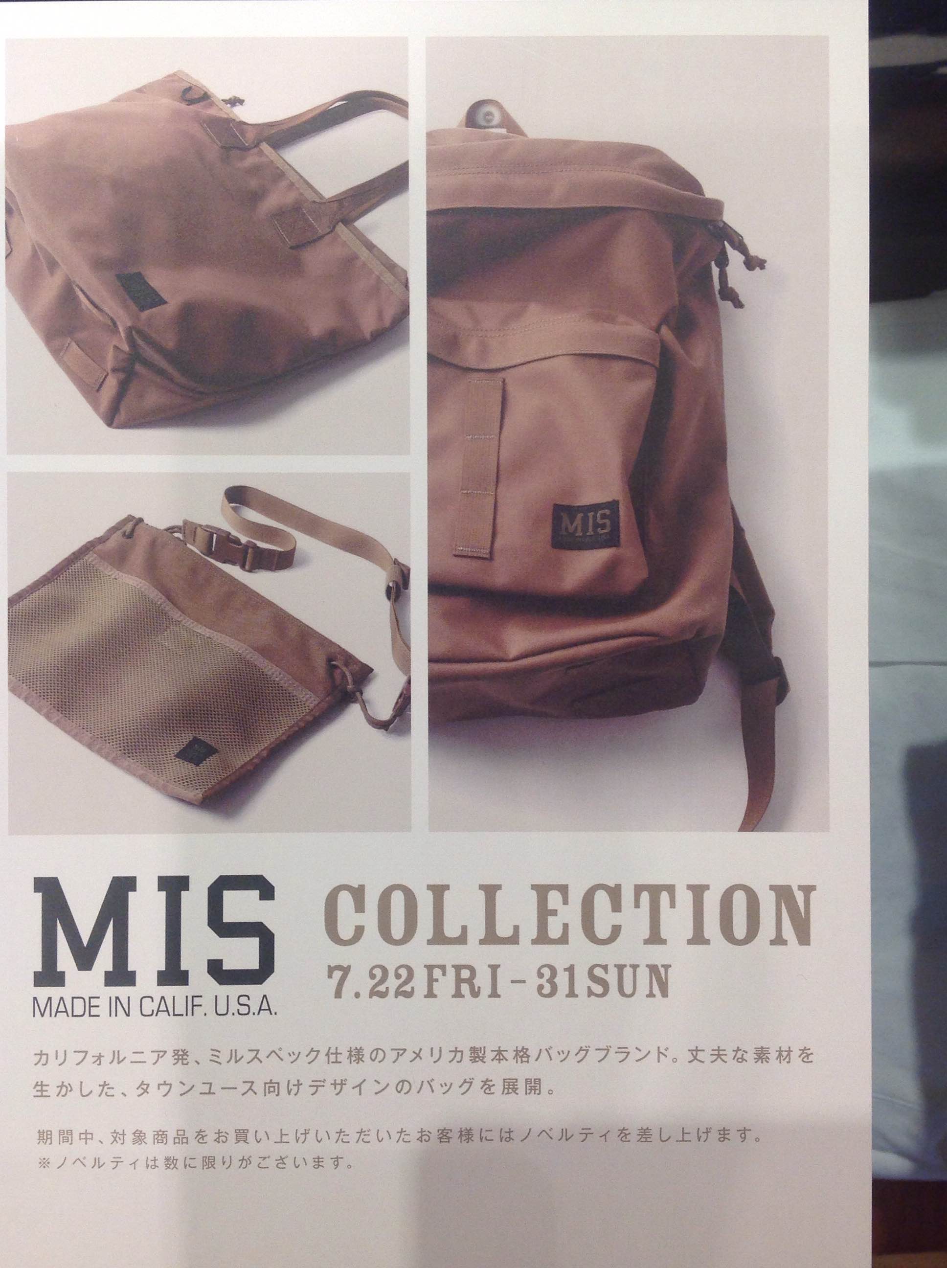 同時にバッグブランド「MIS(エムアイエス)」のコレクションも7月22日~7月31日まで開催しております。