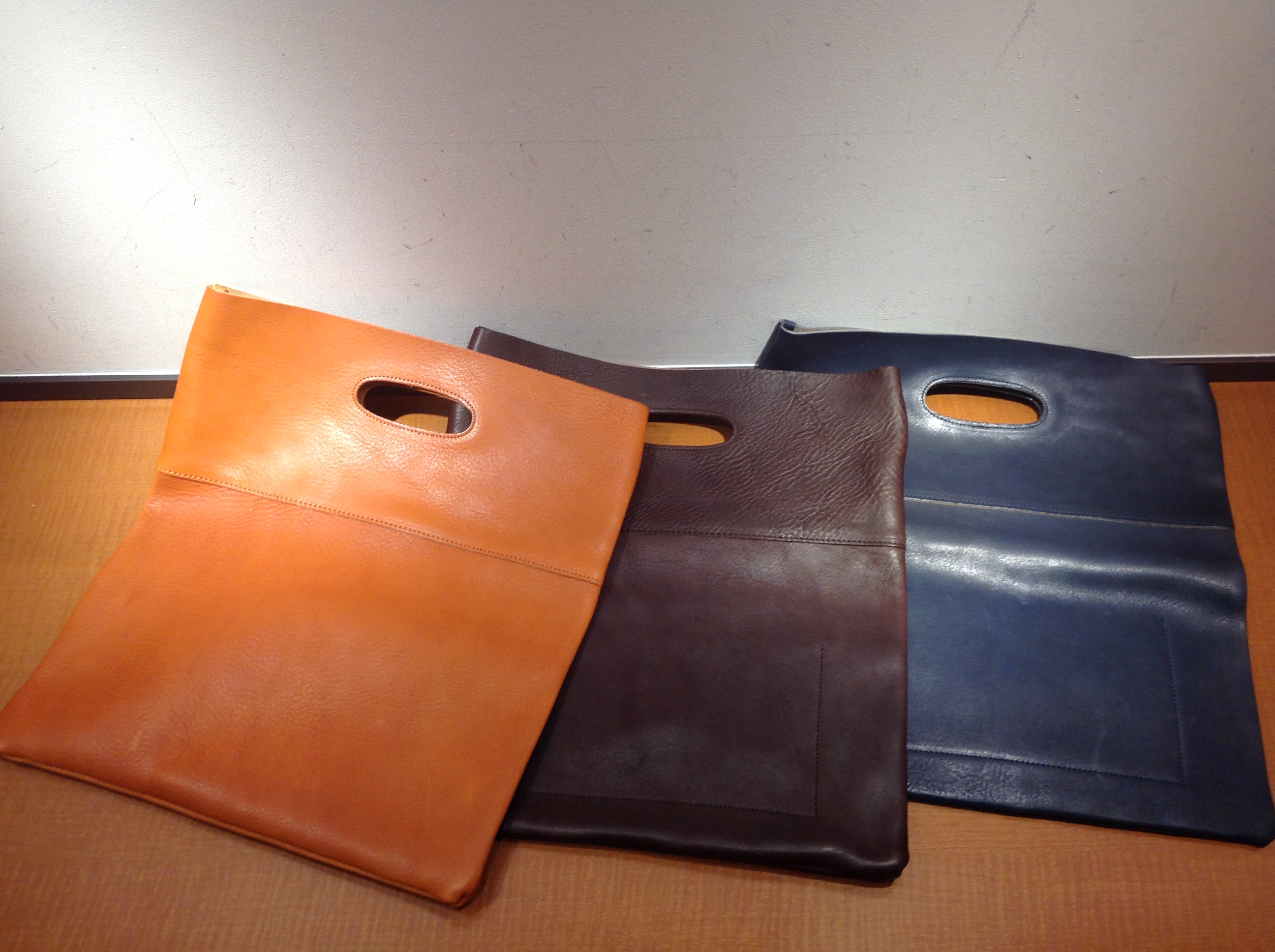 「“栃木レザー” 二つ折り/クラッチバッグ」 型番:118-48-0007 ¥17,500(+TAX) こちらは日本が世界に誇る“栃木レザー”を使用したレザークラッチバッグです。 柔らかく仕上げる為にオイルと共に揉み加工を施した風合いが絶妙で、 使い込む程に特有のクタリ感など経年変化を楽しむことができるアイテムです。 A4サイズのバッグとして取っ手を持って使うもよし、折りたたんでスタイリッシュに使うもよし、 用途に応じて幅広くお使いいただけます。