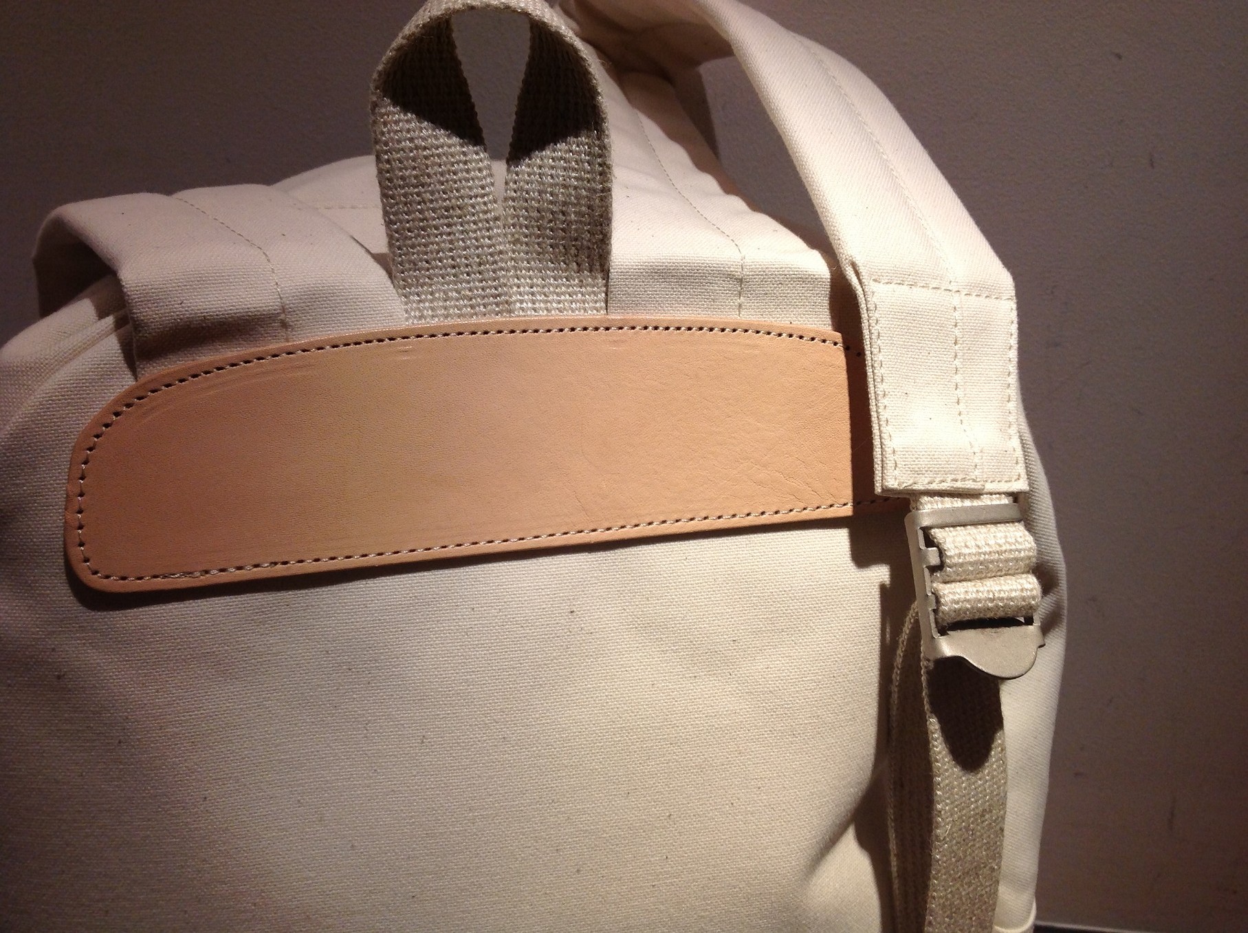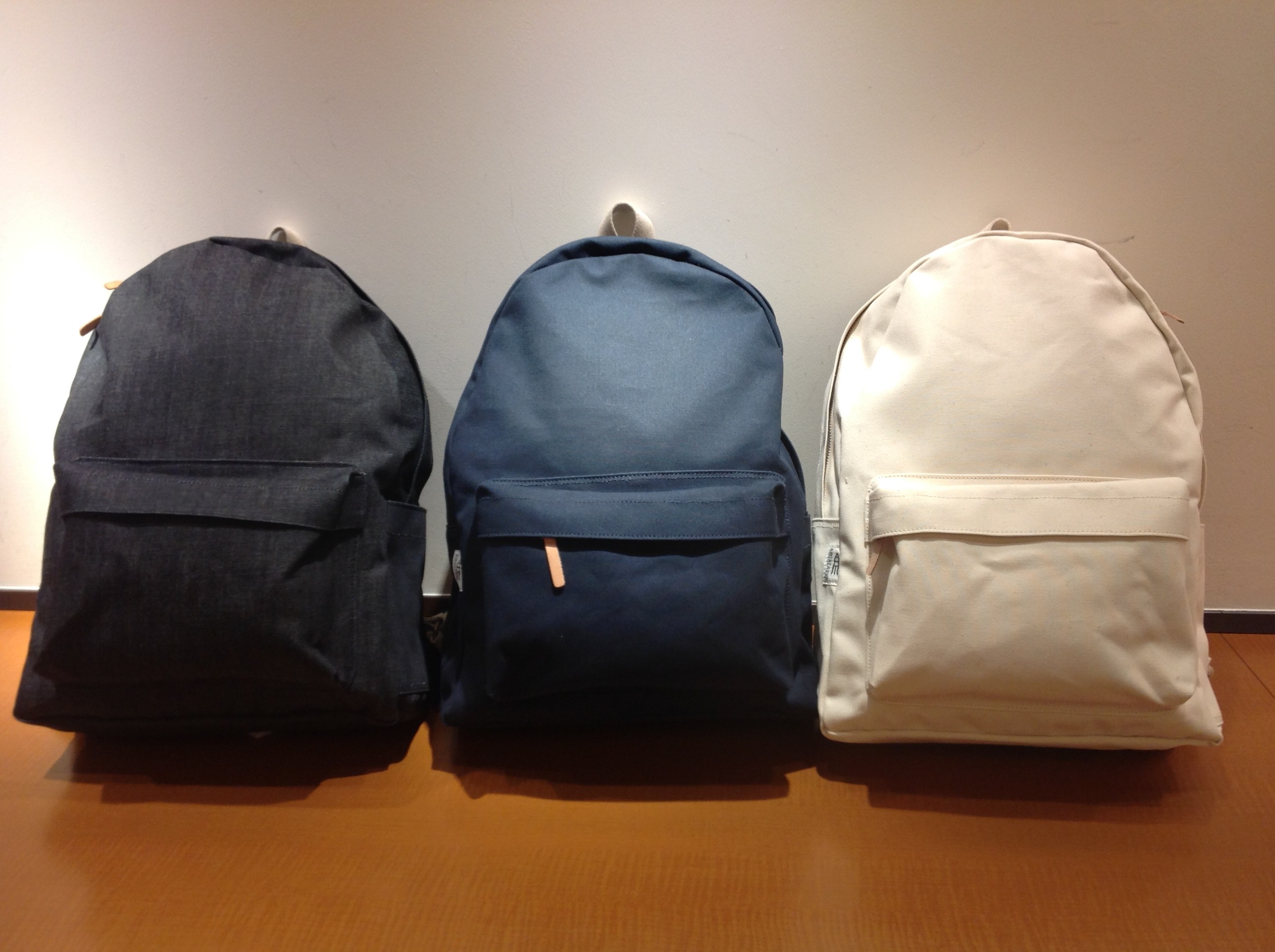 「キャンバス バックパック(デイパック)」 型番:118-43-2712 (デニム地は118-43-2711) ¥15,000(+TAX) このデイパックはシンプルな見た目と裏腹に機能性に溢れています。 立体的で容量にも富んだフロントポケットの他にもサイドポケットもついていますが シルエットには全く無駄がなく、部分使いされたヌメ皮やメタルパーツがアクセントになっています。