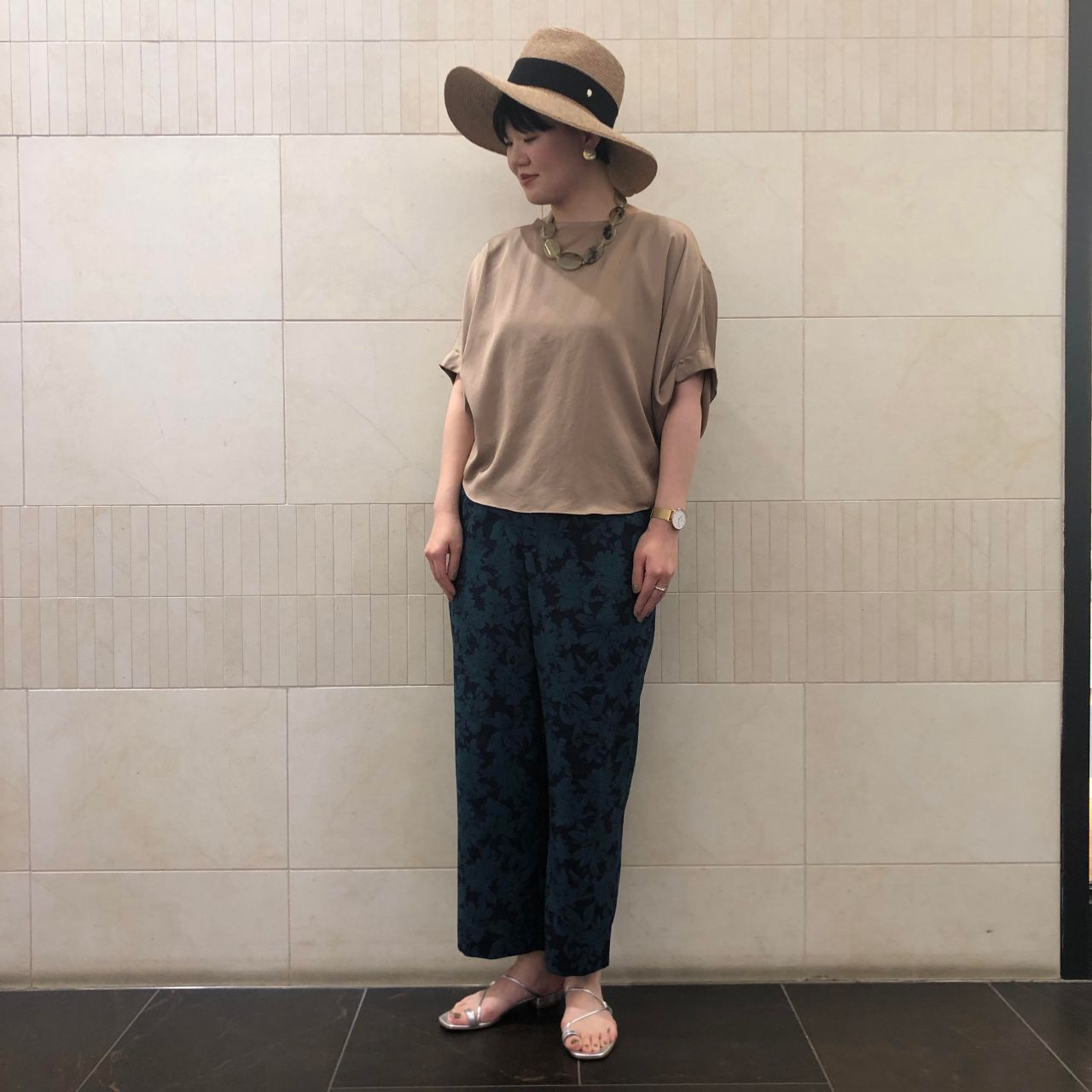 大人めに光沢感のあるブラウスに合わせてタウンよりのコーディネートです。