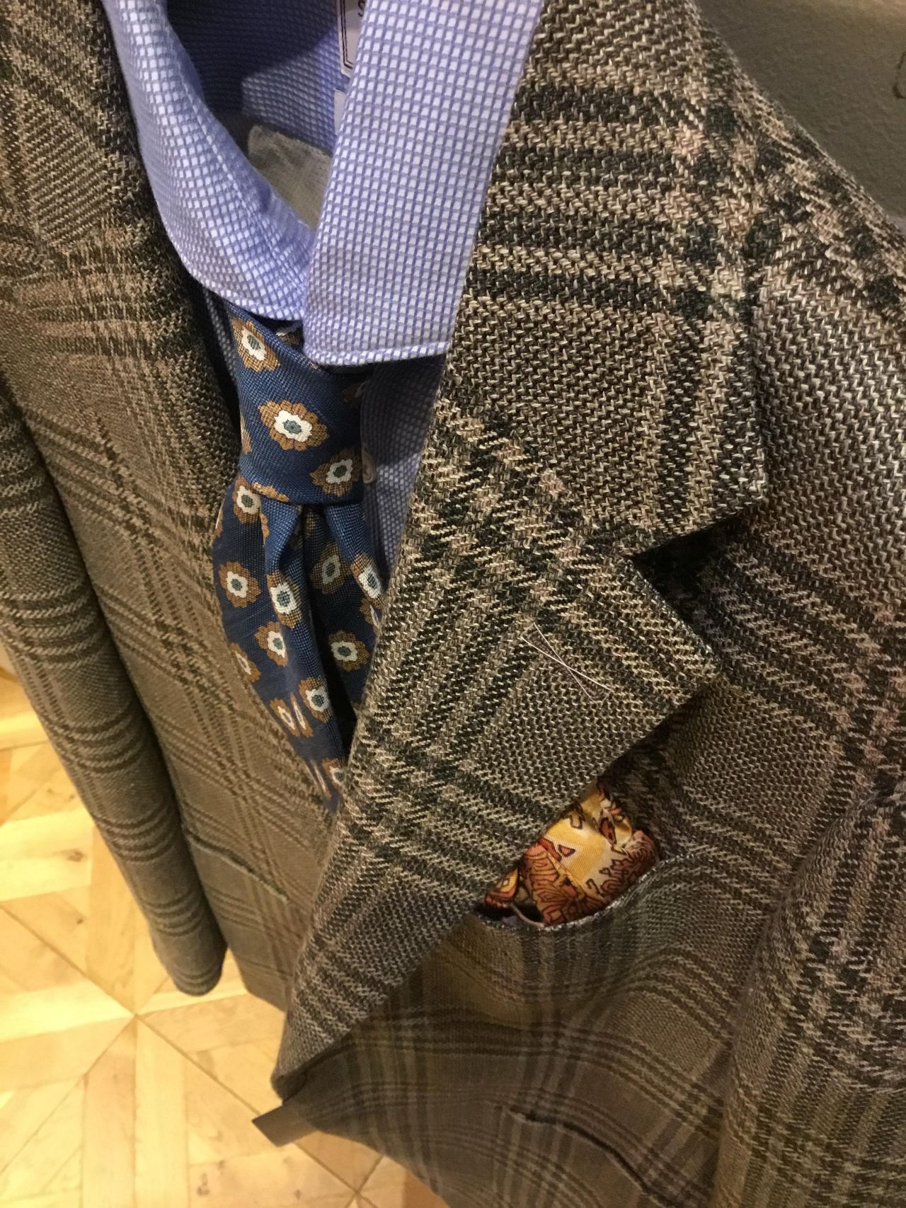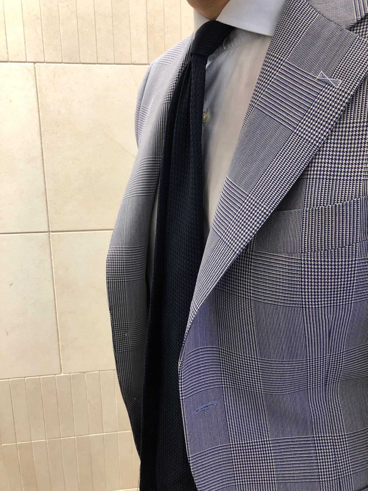 トップバッターはSUITSのようなやや艶やかな生地のグレンチェックのジャケットです。