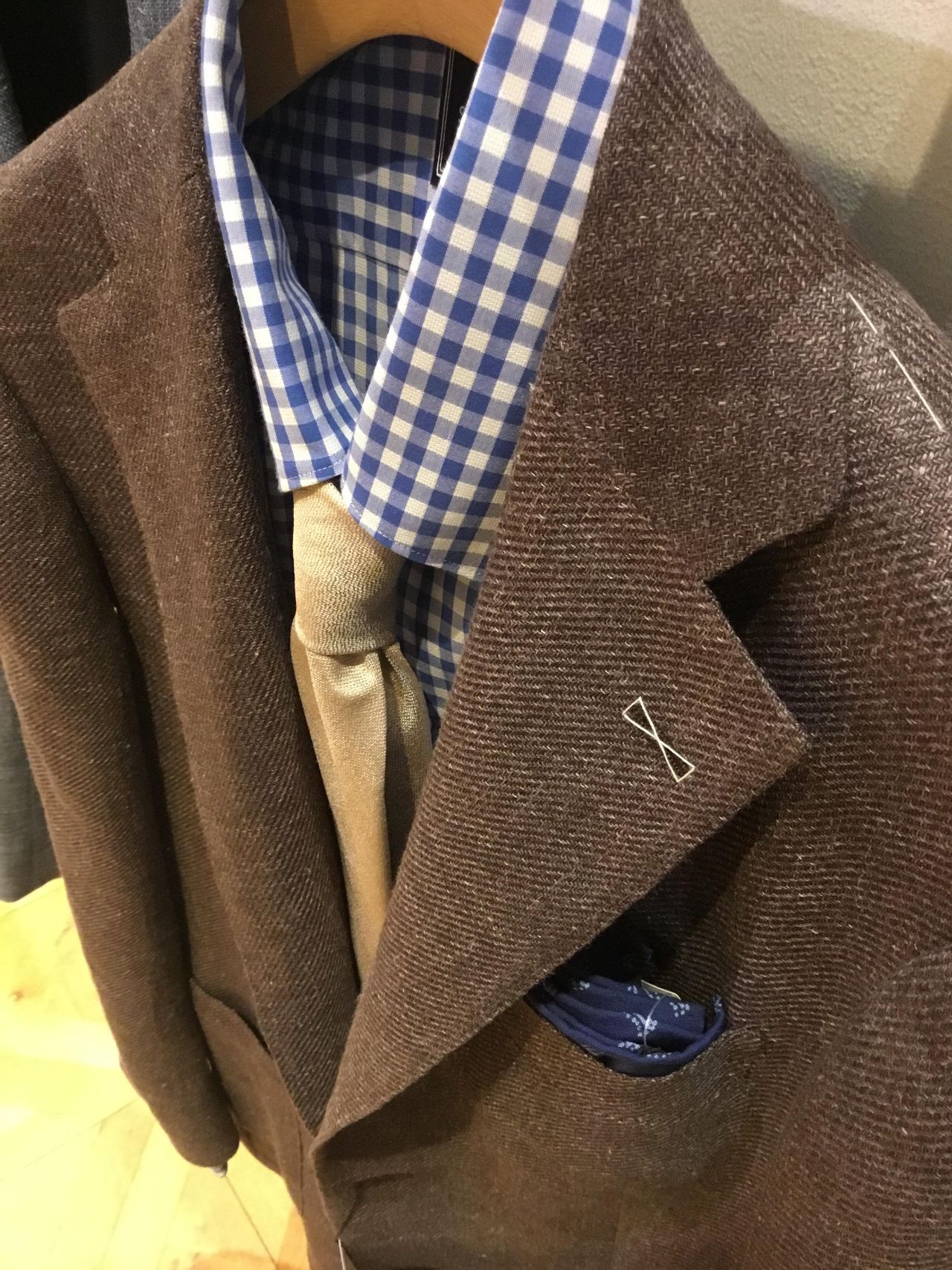 もはや定番とも言えるミディアム・ブラウンのジャケットとグリーンを含んだ色味が新鮮なジャケットです。