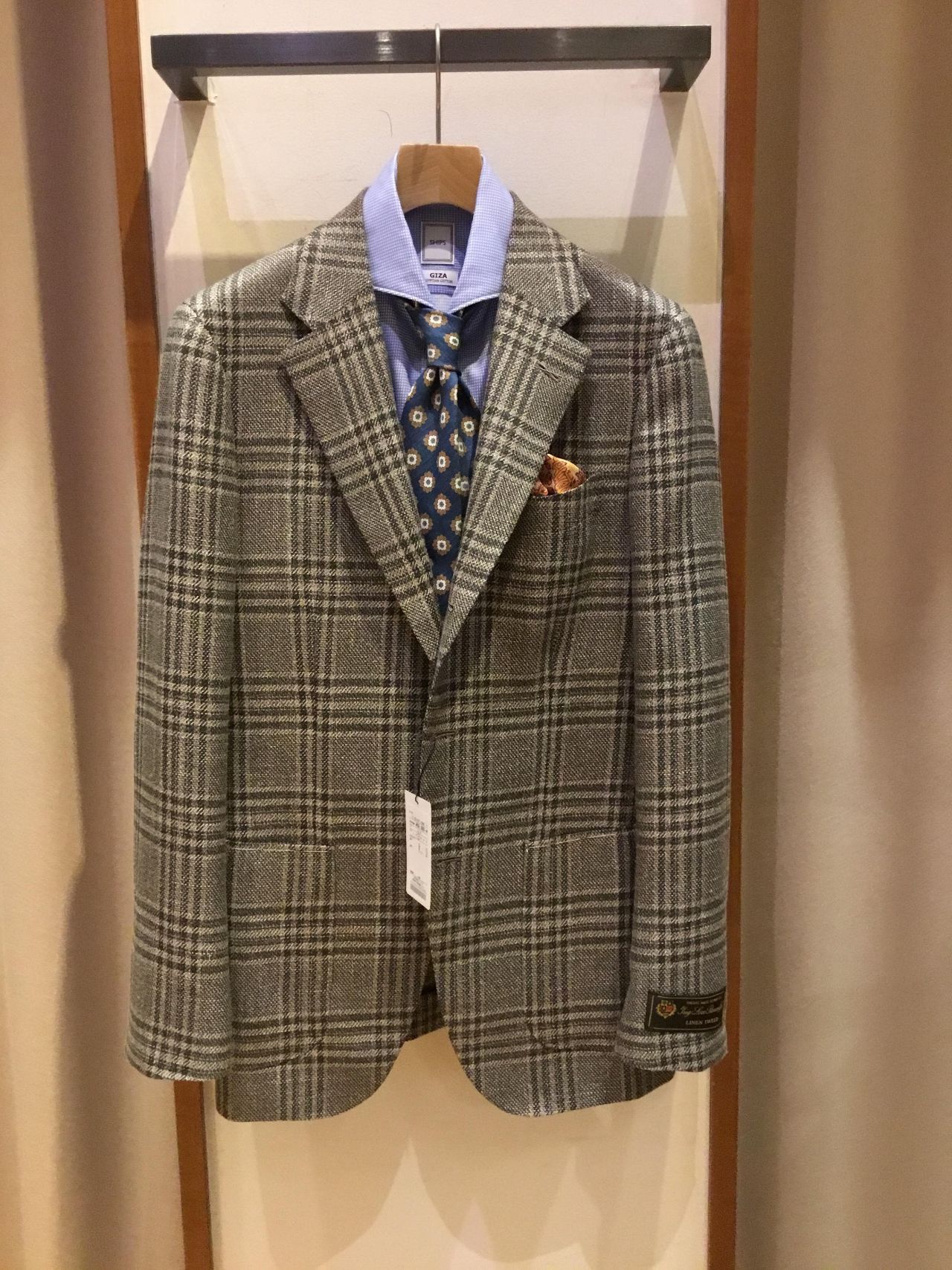 続いてはサマーツイードのようなザクッとした生地感のグレンプレイドチェックのジャケット。