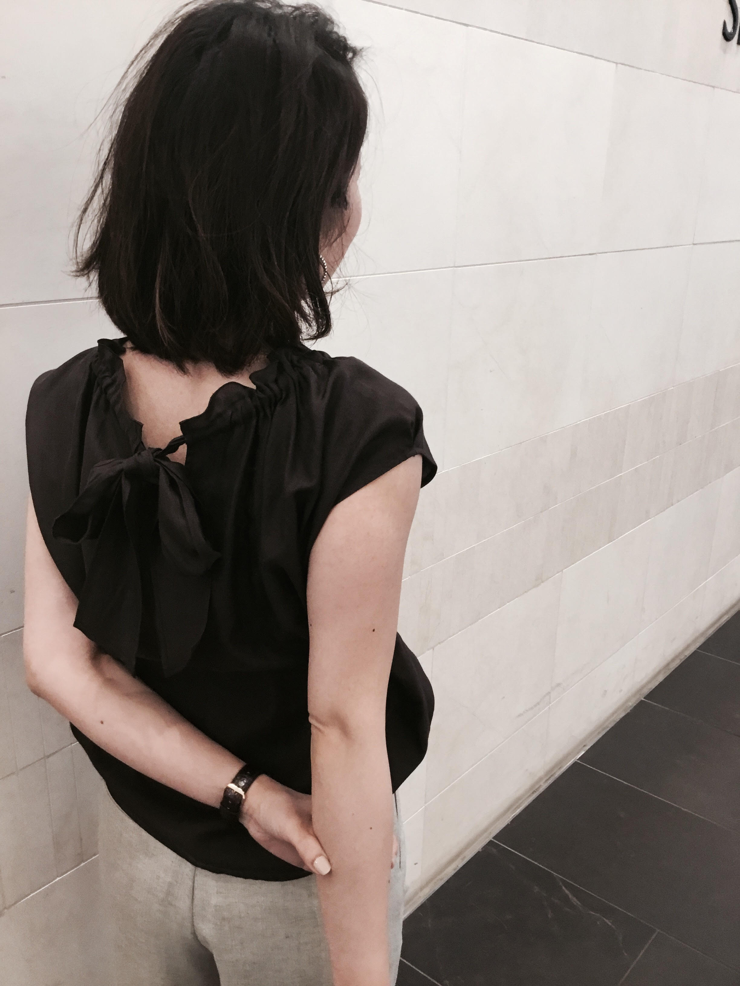 続いては、バックのリボンがアクセントのブラウスです。 着用のカラーはブラウン。 夏にブラウンは珍しいですが、チョコレートのようなかわいいカラーで、落ち着いた印象で着れます。
