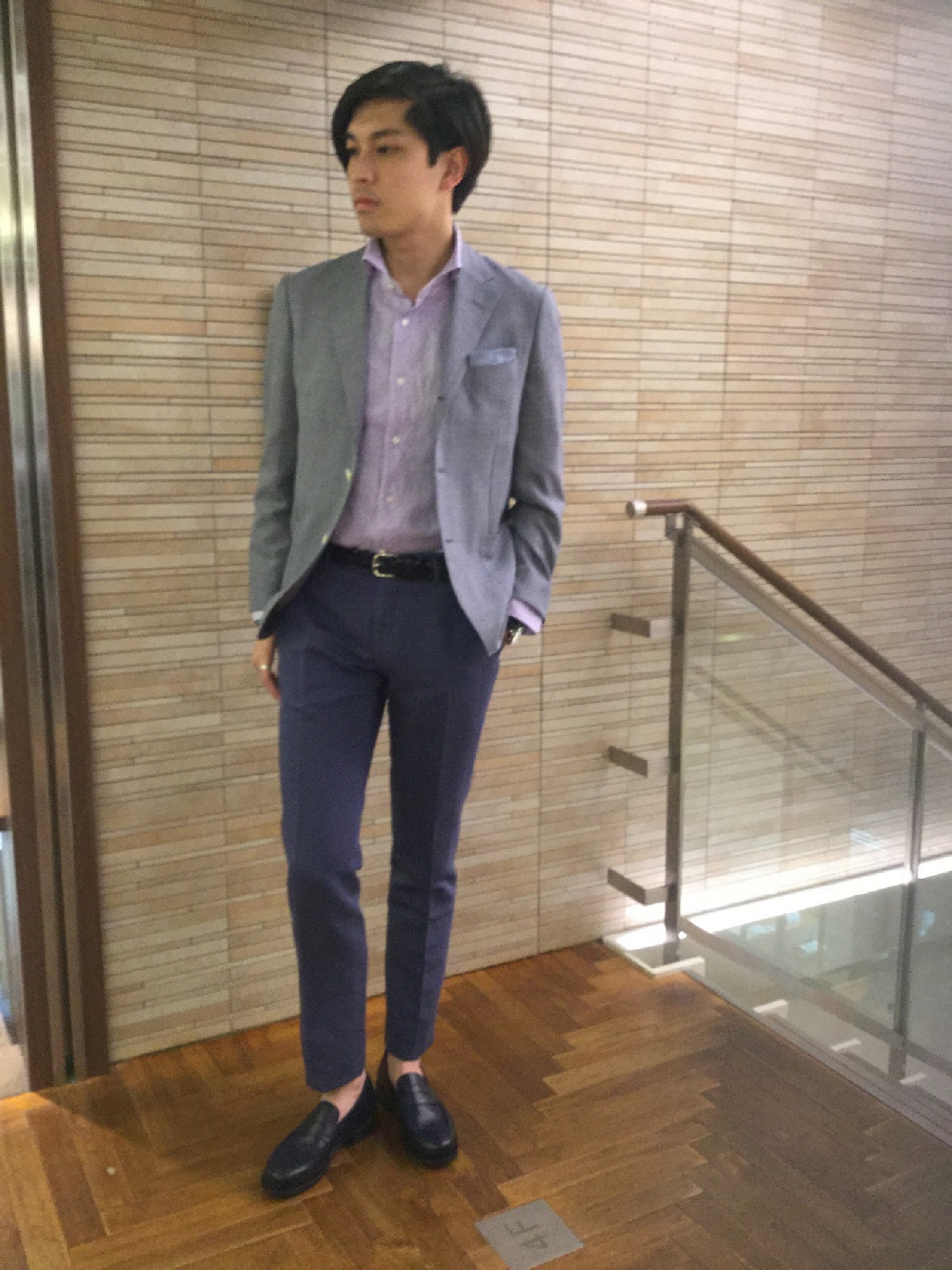 まだ5月頭である為、ジャケットを着ていただきたく、配色はネイビーを基調としたコーディネートのご提案になります。
