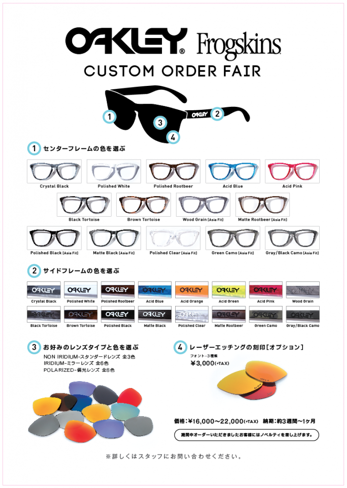 《関連ニュース》 ・[8店舗限定] 世代を超越した人気モデルを自分ナイズする。「OAKLEY Frogskins CUSTOM ORDER FAIR」開催