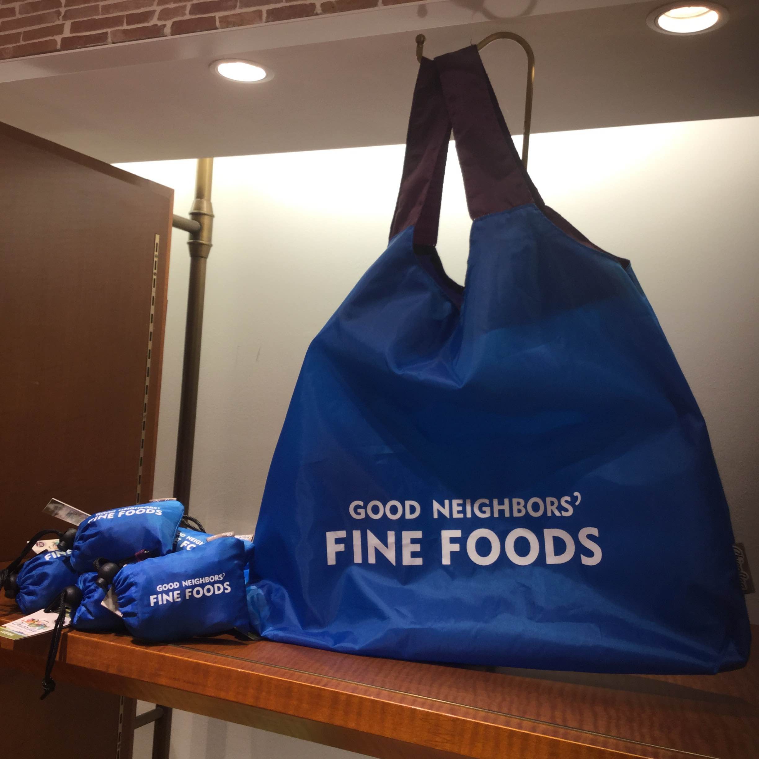 "GOOD NEIGHBORS' FINE FOODS" ・オリジナルチコバッグ ¥1,600(+TAX) 丈夫な素材で折り畳める便利でカラフルなエコバッグ。カラビナが付いているので、バッグに付けてもかわいいですね。
