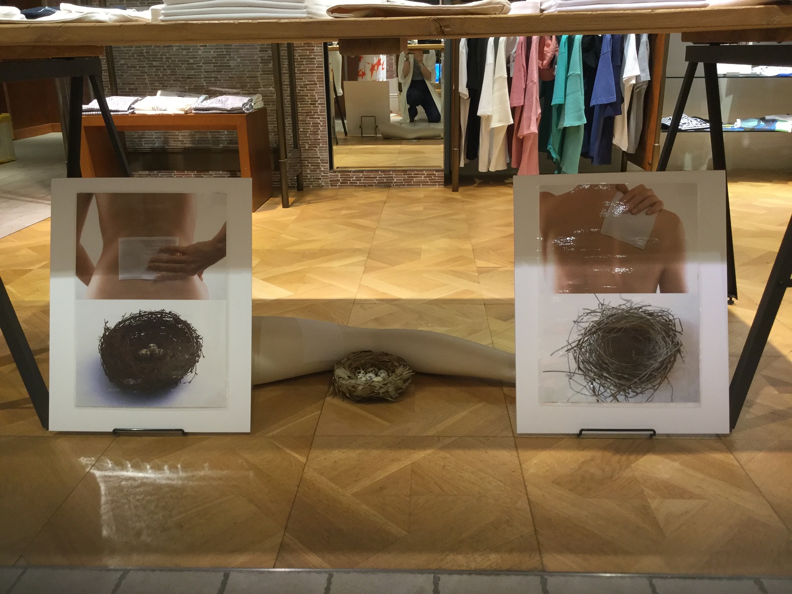 湿布と鳥の巣です。 こちらは現在渋谷店の1階スペースにて展示されております。 この謎のオブジェが展示されているフェアがこちら。