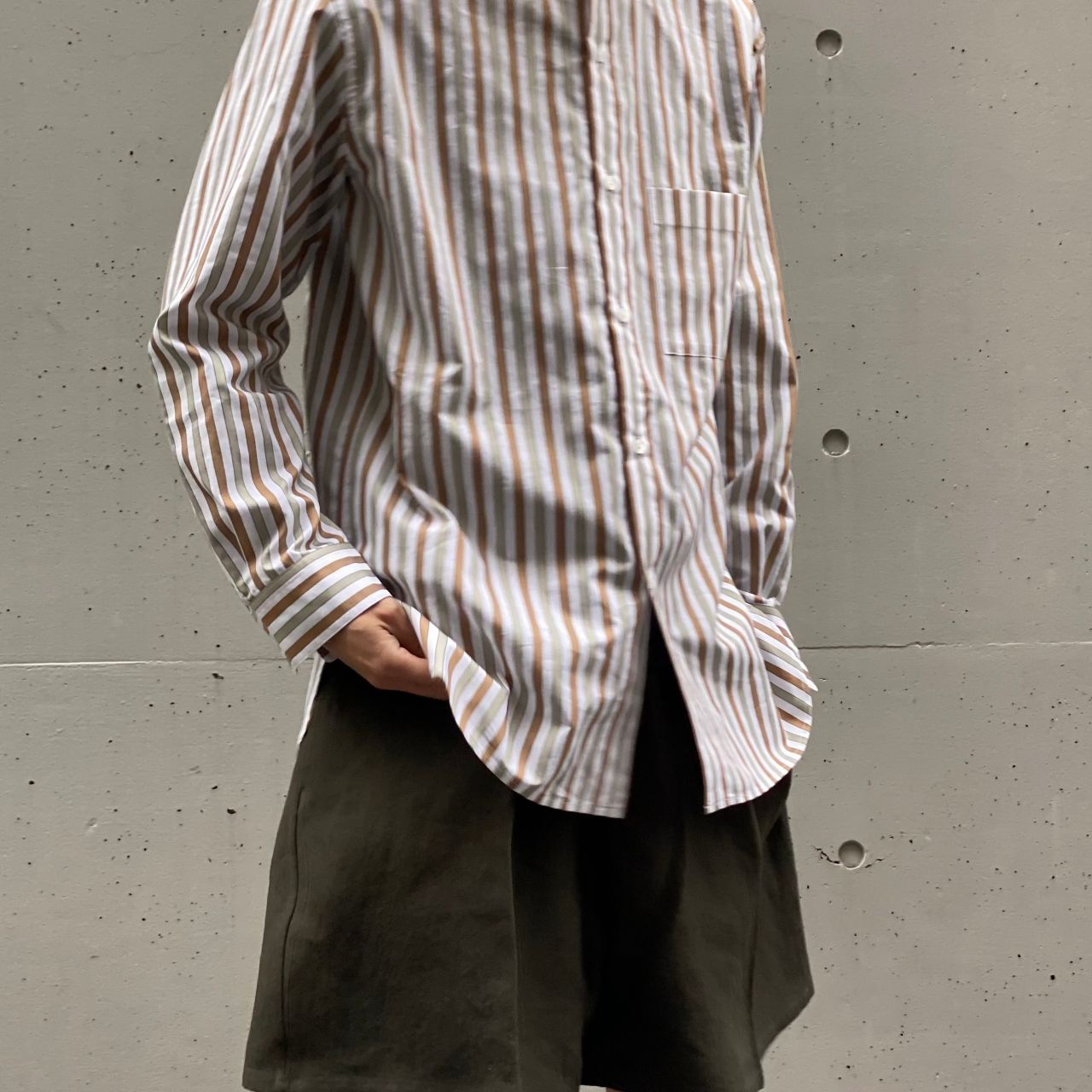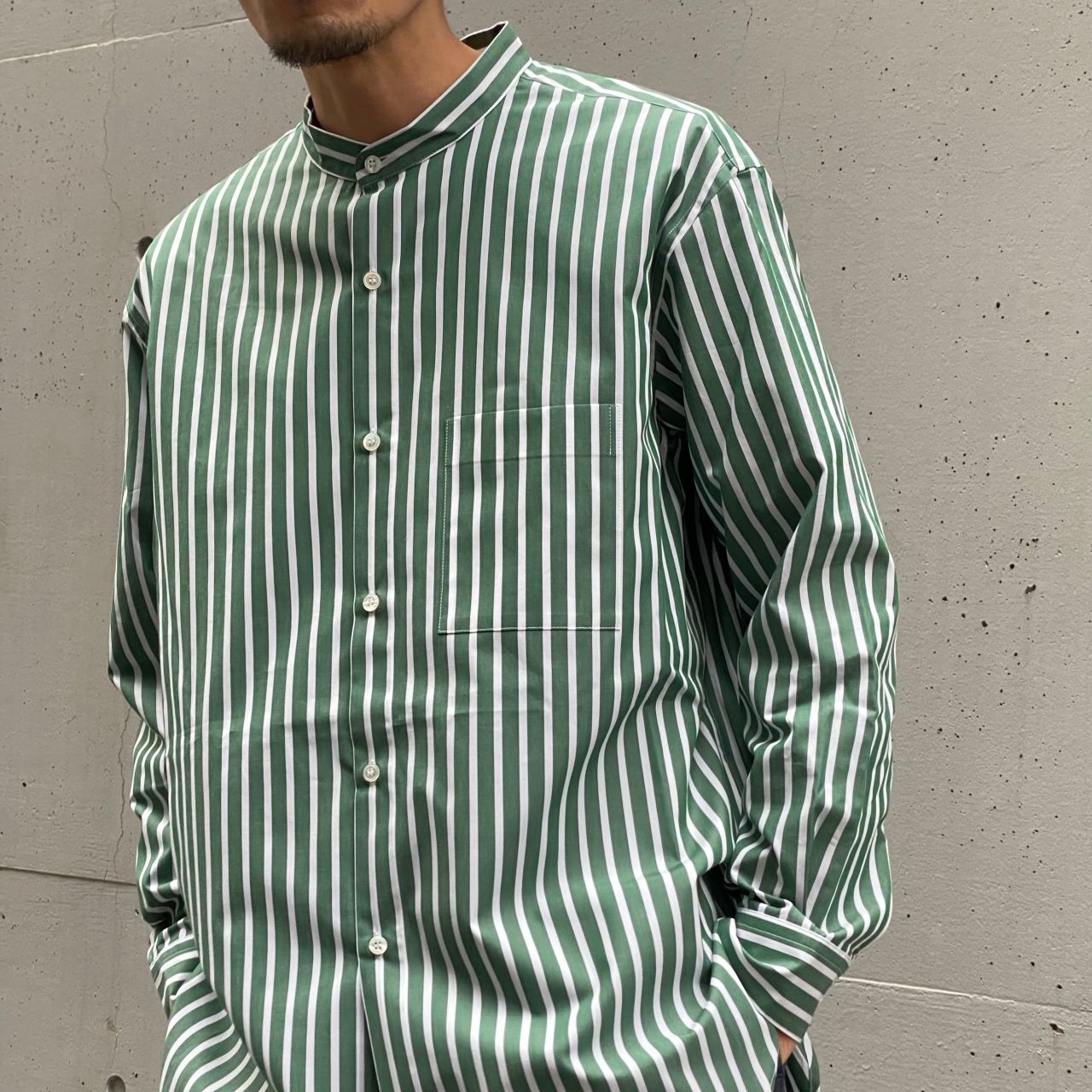 型は定番のマオカラーシャツ。