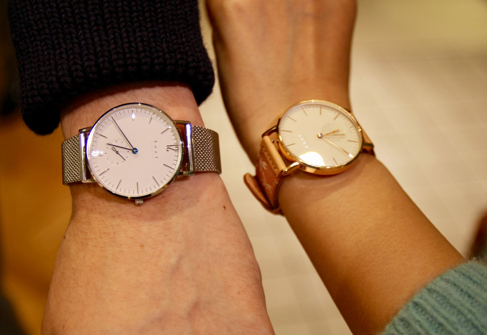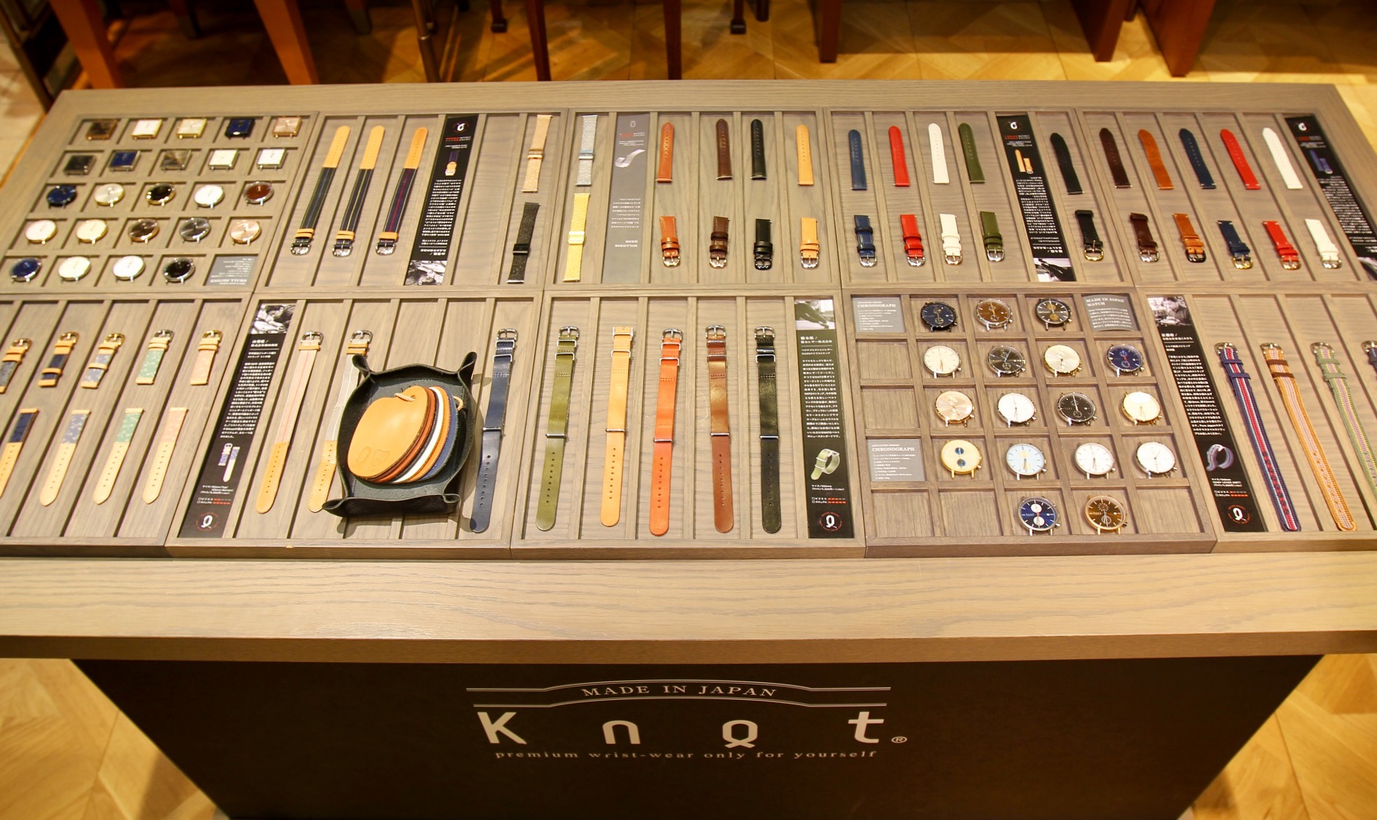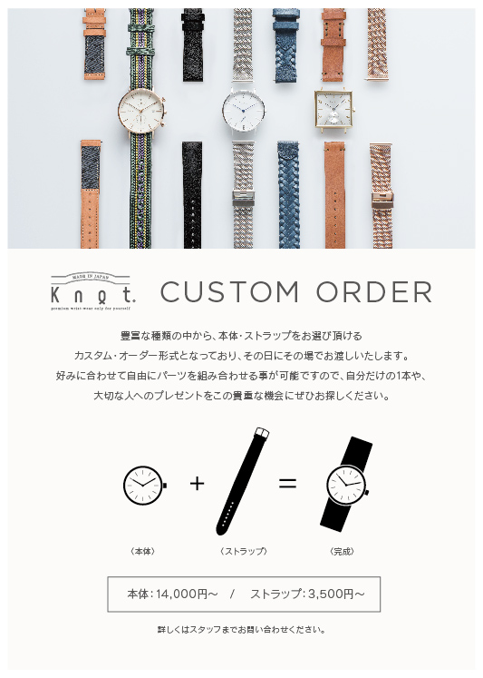 ご存知の方でもそうでない方もまずブランドの説明をさせて頂きます。 Knotとは、、、「リストファッションを気軽に楽しみたい」 「もっとパーソナルを表現したい」 「ベルト交換が煩わしい」 そんな世界中のユーザーの声にお応えし、今まで腕時計を愛用されていない方にも気軽にお楽しみいただく為に10,000円台からカスタムオーダーができる時計です。Tシャツ1枚ほどの価格(2,000円~)から用意された、全30種類以上のストラップにはEasy Leverが標準装備され、工具を一切必要とせずに全ての時計本体に装着が可能です。 その日のファッションや多様化するライフスタイルに合わせて、自分だけのリストウェアをお楽しみいただけます。 特筆すべきはあの煩わしいベルトの交換がワンタッチで出来ること! ベルトの交換って専用の器具が無いと出来ない場合が多く、億劫になってしまいお洋服との合わせやその日の気分で替えたくても替えられませんよね、、、 私自身も今日はこの組み合わせじゃないな。と考える時がたまにあります。 ですが!Knotのベルトは先程もお伝えしたとおり、ストラップにはEasy Leverというものがありどなたでもすぐに脱着が可能です。 本体、ベルトを組み合わせて7.000通りもある中から自分好みの1本を選んでいただけます。