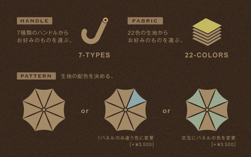 パターンオーダーになりますが7種類のハンドル、22色の生地よりオーダーしていただけます。 他の人と被る事もなく英国最高峰の傘を持つことができる又とないチャンスです。