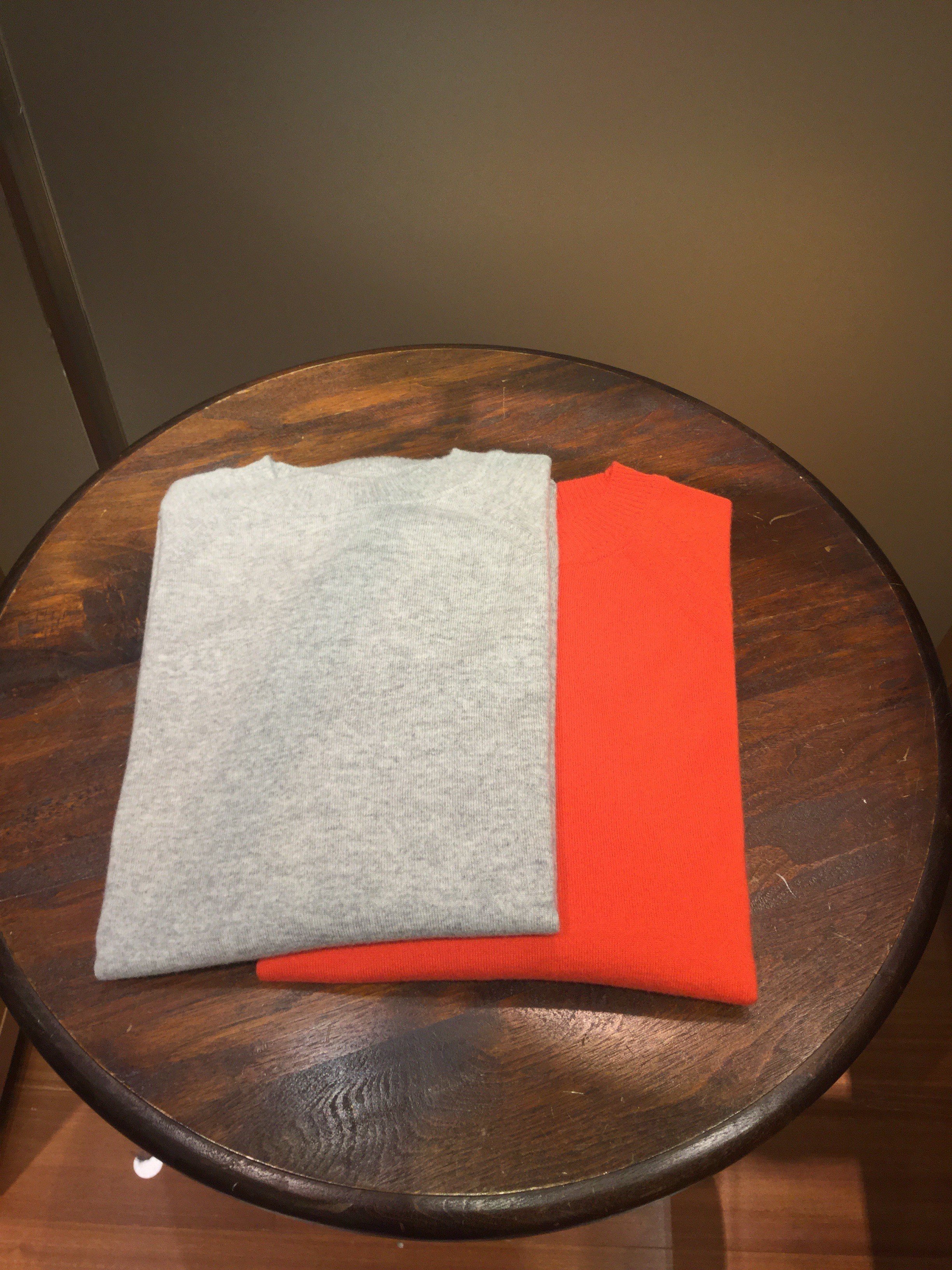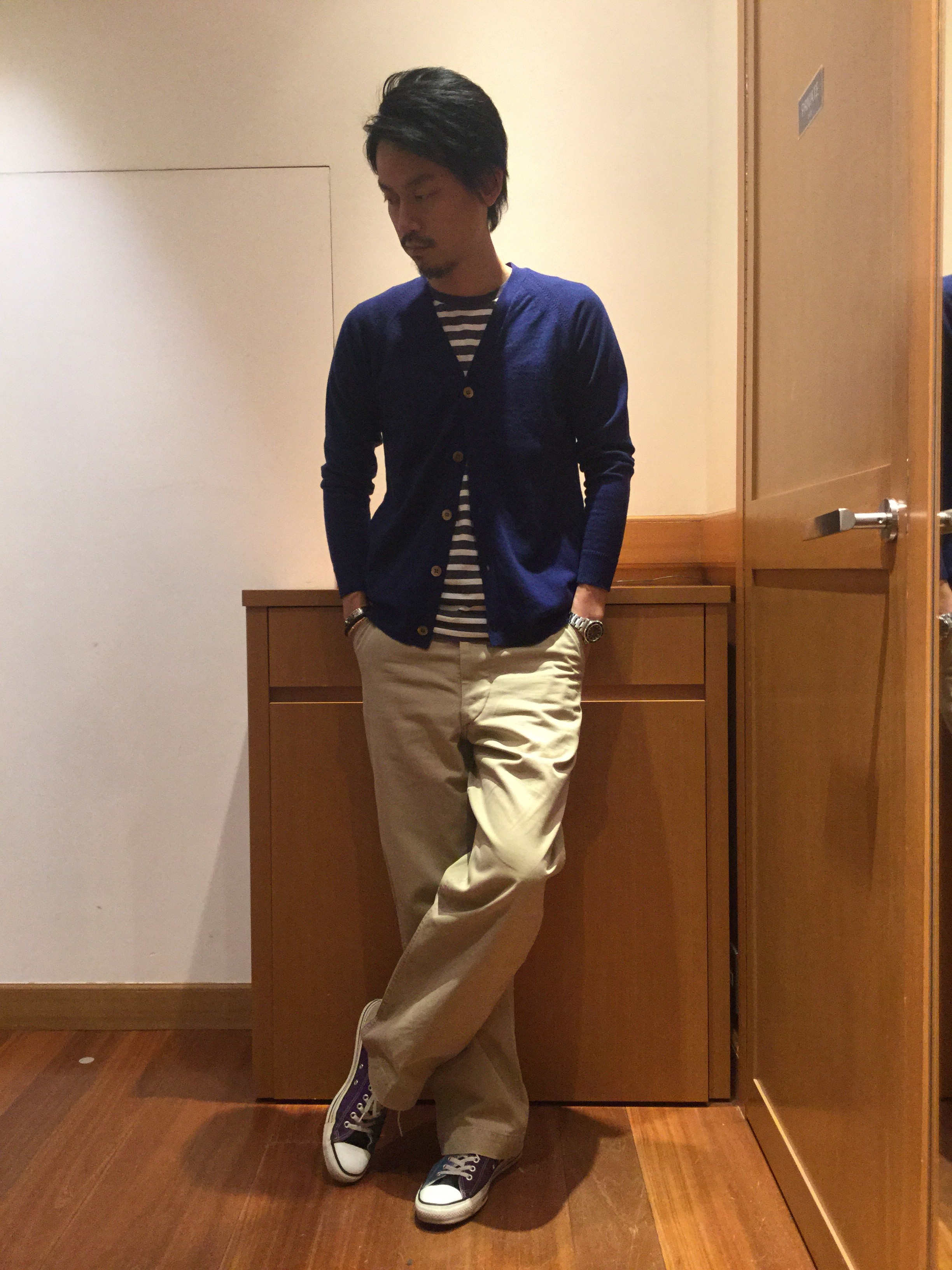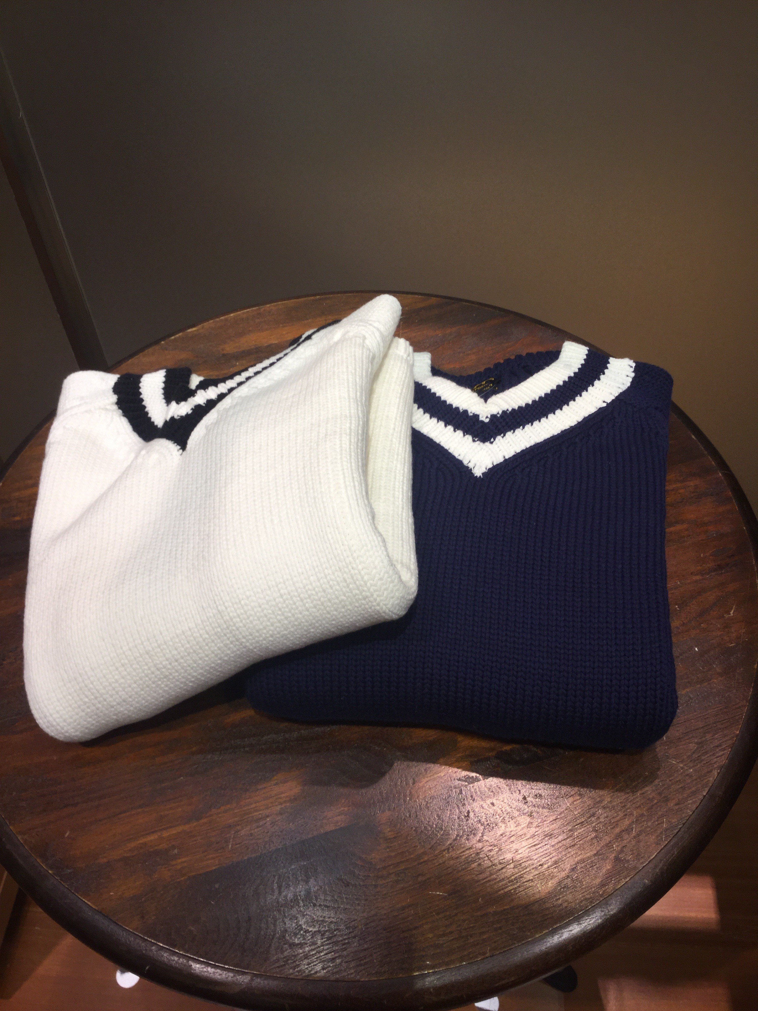 冬でもカシミアは着ますが、この鮮やかな色は春ならでは。   コットン素材からはVネックのチルデンニットと