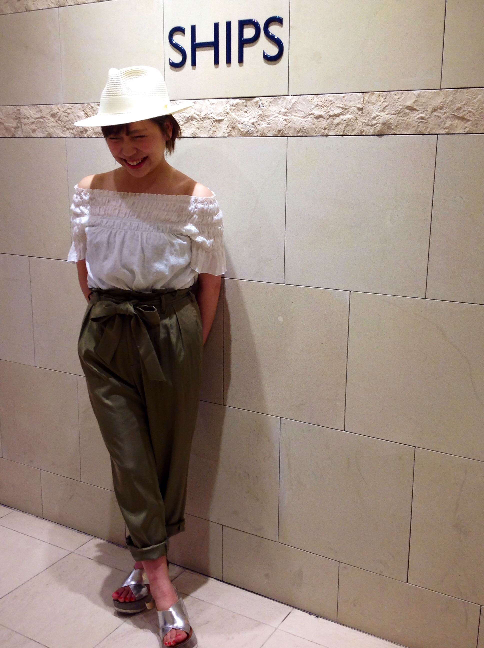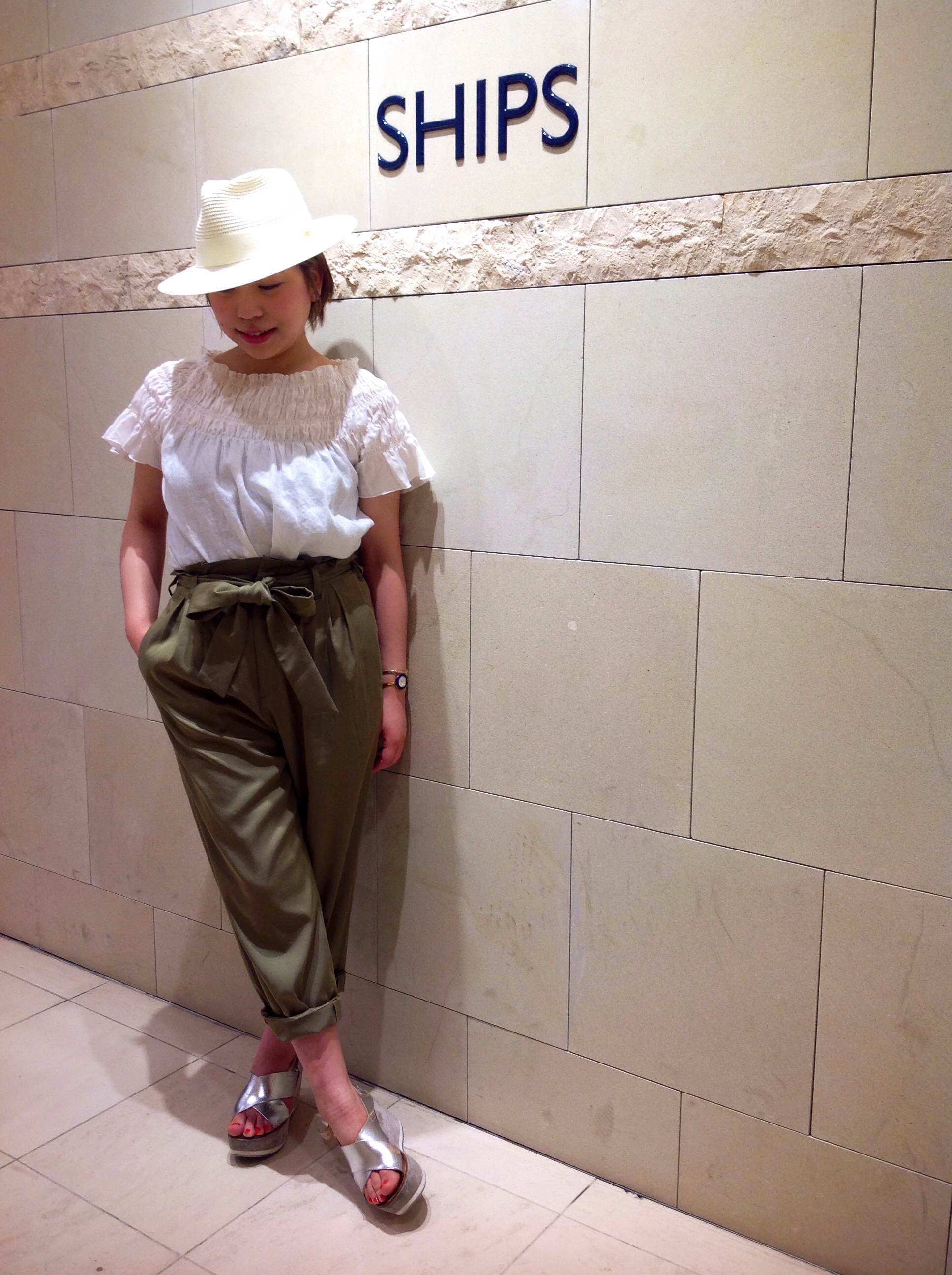 雰囲気も変わり 夏らしさがさらにグーンとupします。 オフショルダーを着たことがない方は このトップスでこの夏チャレンジしてみてはいかがでしょうか^^ パンツもリボンを外して頂くとより落ち着いた感じになります。 夏は着回ししやすい服で いろいろなバリエーションでコーディネートしていきたいですね。 皆様のご来店お待ちしております!! SHIPS新宿店 齋藤