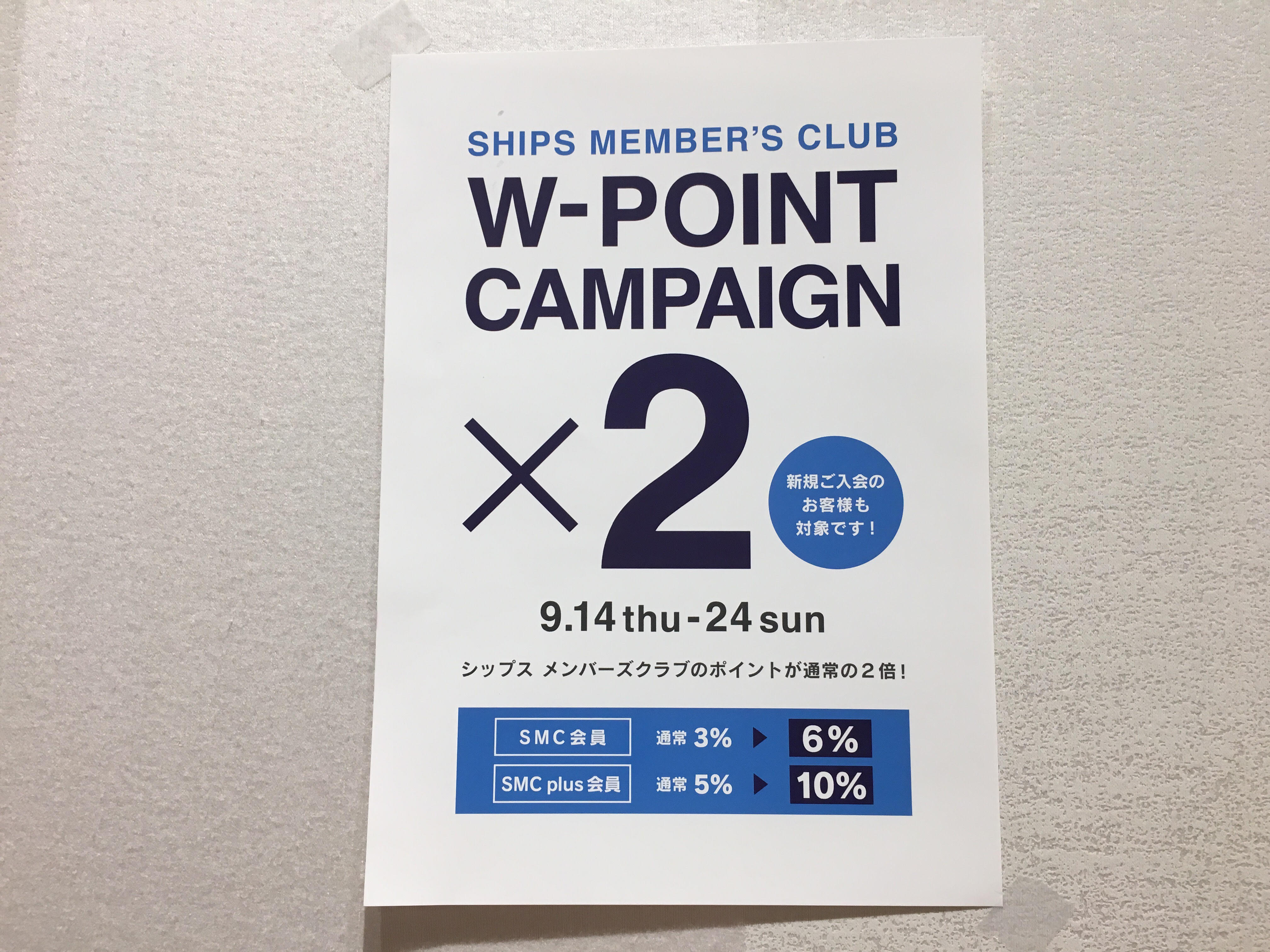9/14(木) ~ 9/24(日)まで、「SHIPS Member’s Club W-POINT CAMPAIGN」を開催致しております。ポイントが通常よりも倍に!!