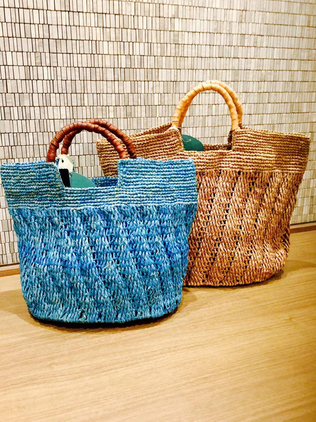 310-01-2142 左・MMM:TOTE(S)  ¥14,000(+TAX) 310-01-2143 右・MMM:TOTE(M) ¥17,000(+TAX) MMM(エムエムエム)・・・フランス人女性デザイナーにょるマダガスカル製のバッグブランド 。 柔らかい風合いで、色合いも他のカゴバックにはない珍しい色。夏のコーディネートに差し色として使っても◎       IMG_0637