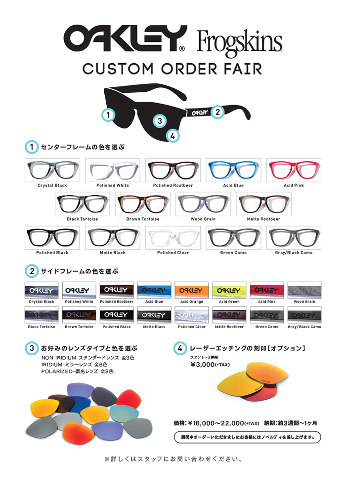 ちょっと見え辛いのですが上みたいな感じでカスタムできます。 なんとその組み合わせ3808通り!!! 3808通りですよみなさん。こち亀の巻数約20倍です。こんな凄まじい数字初めてみましたよ。   自分用にはもちろん、かわいいあの子や愛する奥様へのプレゼントとしても最適ですよね。   (ちなみに完全オーダーの為納期が3週間~1ヶ月程いただきます。。すみません。。。)   ご不明点等あればお気軽にお電話下さい。     ではでは皆様も是非このオークリー祭りにご参加下さいませ。   ご来店心の奥の奥の奥底からお待ち申し上げております。     《関連ニュース》 ・[8店舗限定] 世代を超越した人気モデルを自分ナイズする。「OAKLEY Frogskins CUSTOM ORDER FAIR」開催