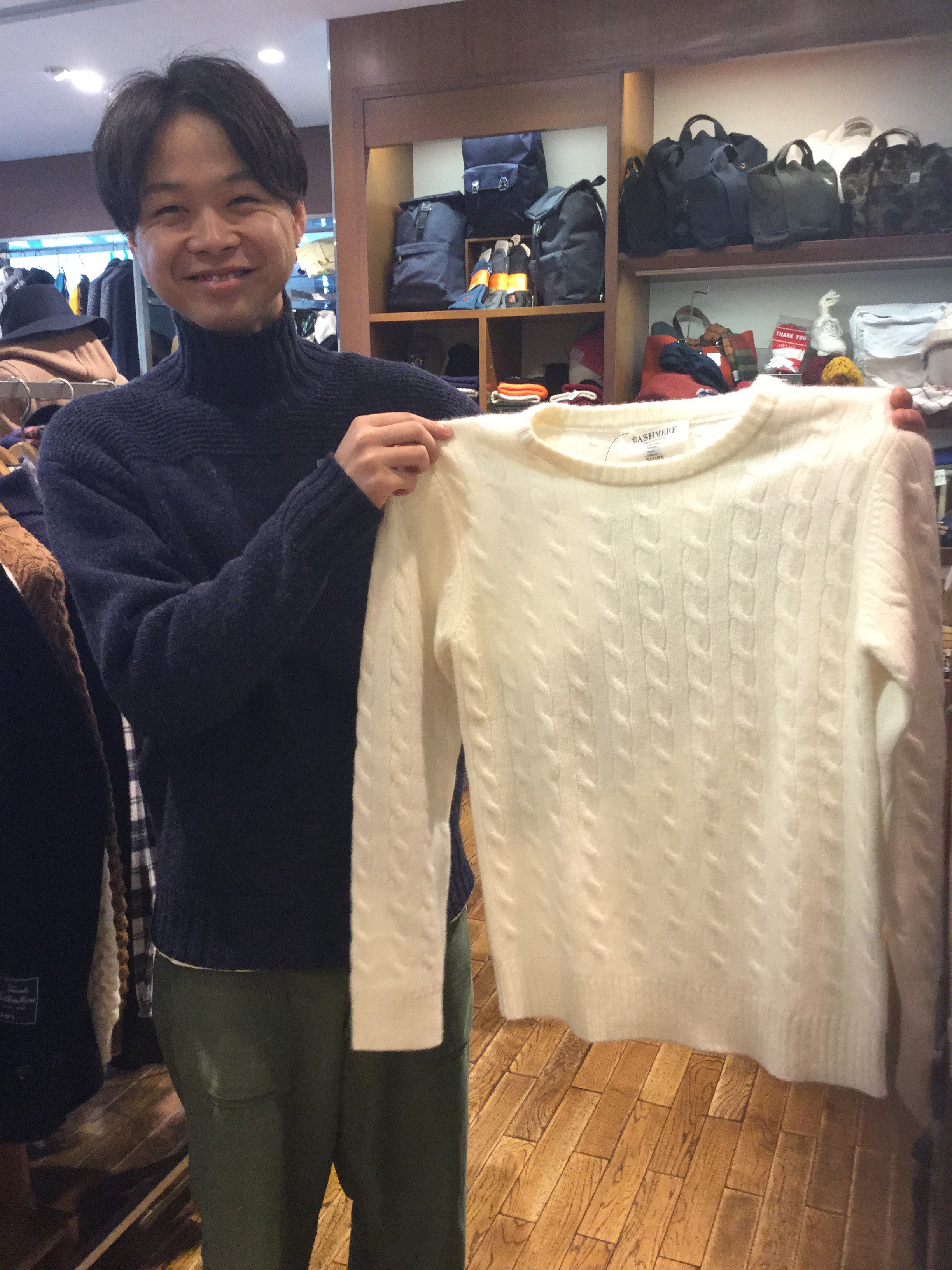 カシミヤ素材のニットです!!肌触りすごい気持ち良いです!! 「ニットは今の時期すぐ使えるので貰ったら嬉しい!!」 とスタッフ安藤。 良い笑顔です。 最後はMEN'S DRESS担当の河野がオススメするアイテム!
