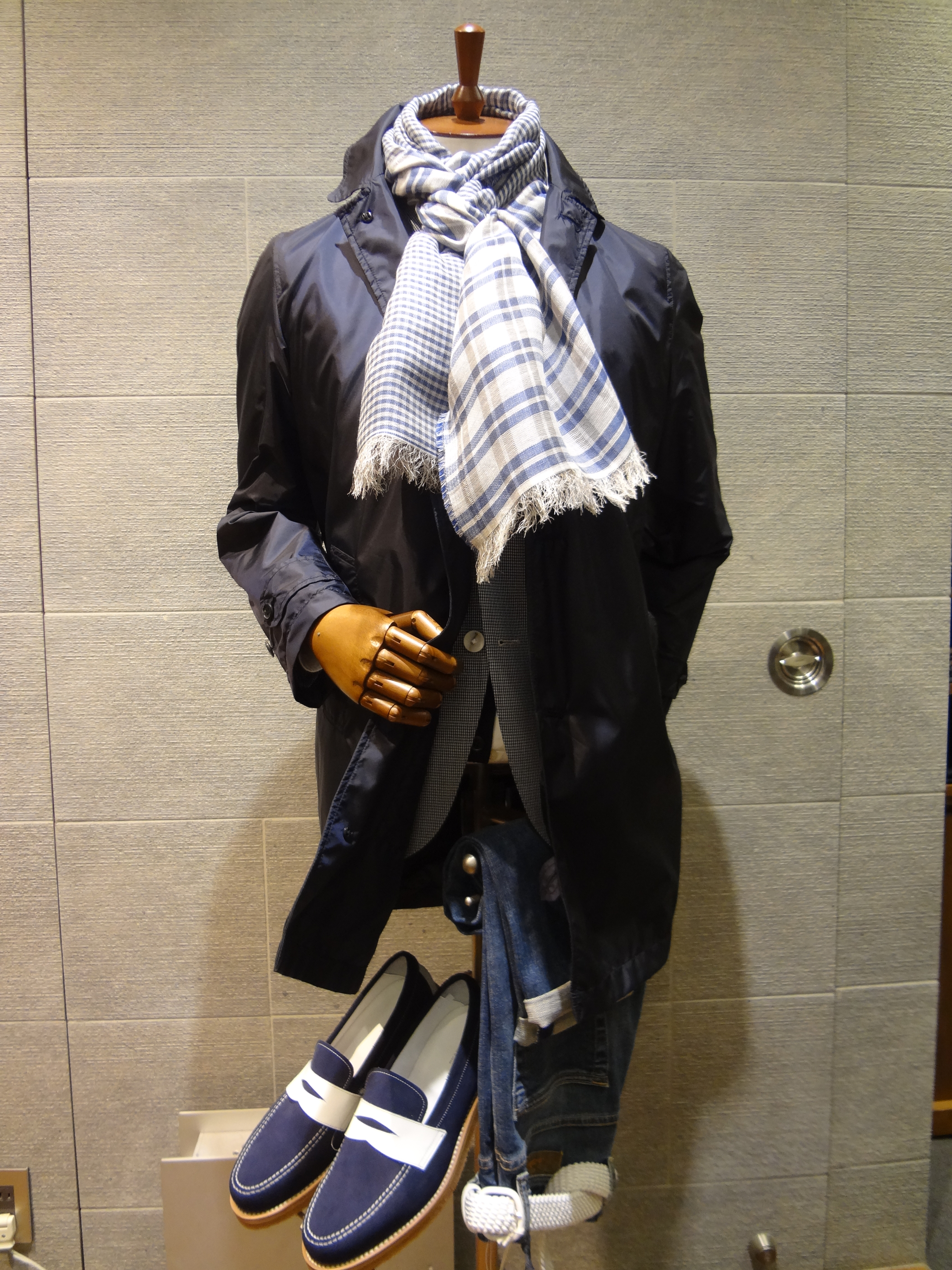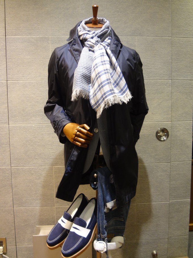 COAT 114-11-0480-78COL ¥39900(税込) JACKET 117-01-1953-78COL ¥57750(税込) SHIRTS 111-113517-02COL ¥19950(税込) PANTS 113-11-3072-75COL ¥31500(税込) CHIEF 1218-61-0164-02COL ¥3990(税込) BELT 118-13-1031-02COL ¥8400(税込) SHOES 115-13-0678-78COL ¥39900(税込) こちらは薄い3枚(2枚がチェック(大、小)、1枚が無地)の生地を使ったストールになります。 片側だけ3枚の生地を縫い合わせており、それぞれを表に出して1種類ずつ楽しむのはもちろん、画像のようにラフに巻くことで全ての柄をグラデーションで楽しむこともできるストールです。 今回はもう一つご紹介させて頂きます。 こちらの【ARIANNA】(アリアンナ)のストールになります。
