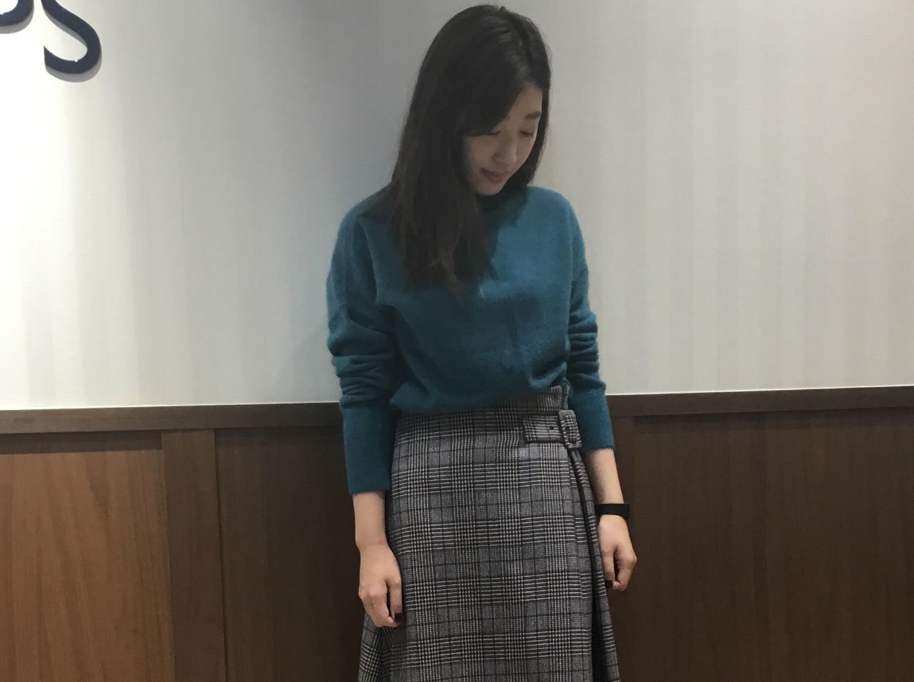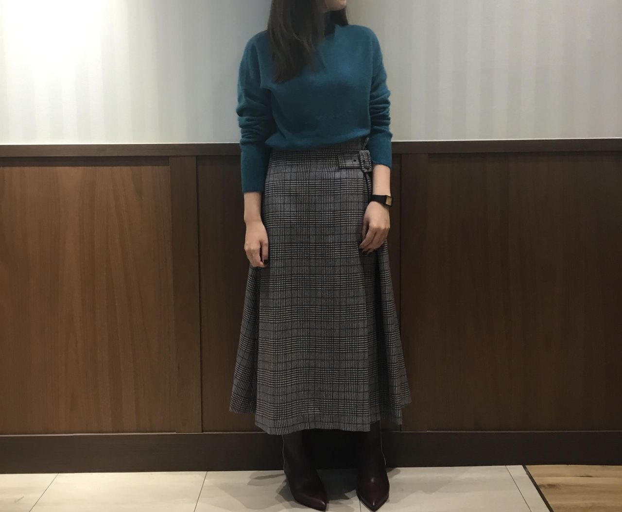 ウエストベルトがポイントのチェックスカートと合わせると、はっと目をひく冬のコーディネートに♪