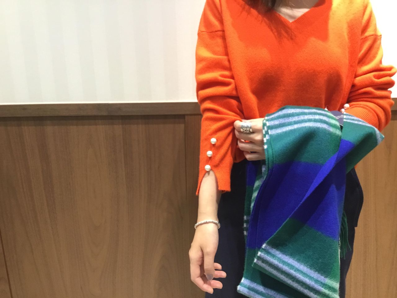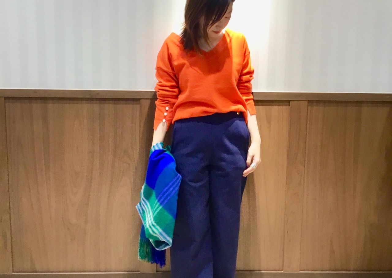 鮮やかなレッドオレンジが魅力的なVネックニット。