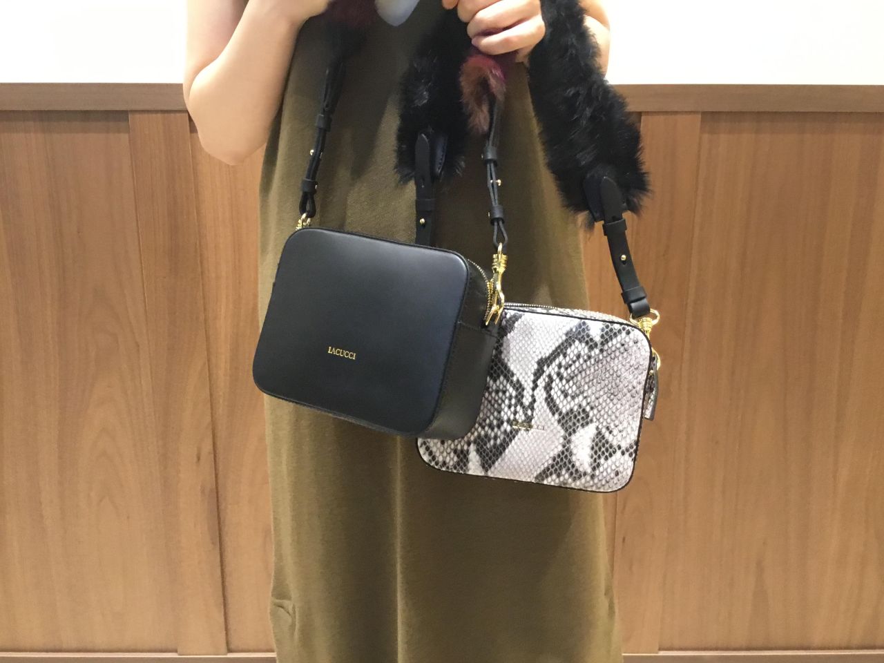 ファーの持ち手が可愛いミニマムなショルダーバッグ。