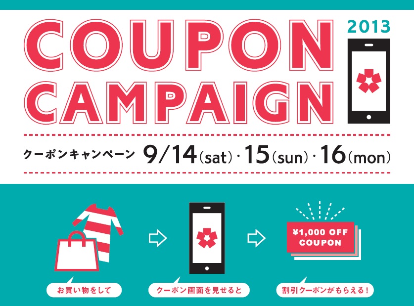 クーポンキャンペーン 9月14日(土)・15日(日)・16日(月・祝) 期間中、フジイダイマルモバイル会員様を対象に、1レシートで10,000円お買い上げ毎に、 次回のお買い物から藤井大丸の各ショップでお使いいただける 「1,000円OFFクーポン」を1枚プレゼントいたします。 とてもお得な期間ですので、是非おまちしております♪ ★詳しくはこちら→http://mb.fujiidaimaru.co.jp