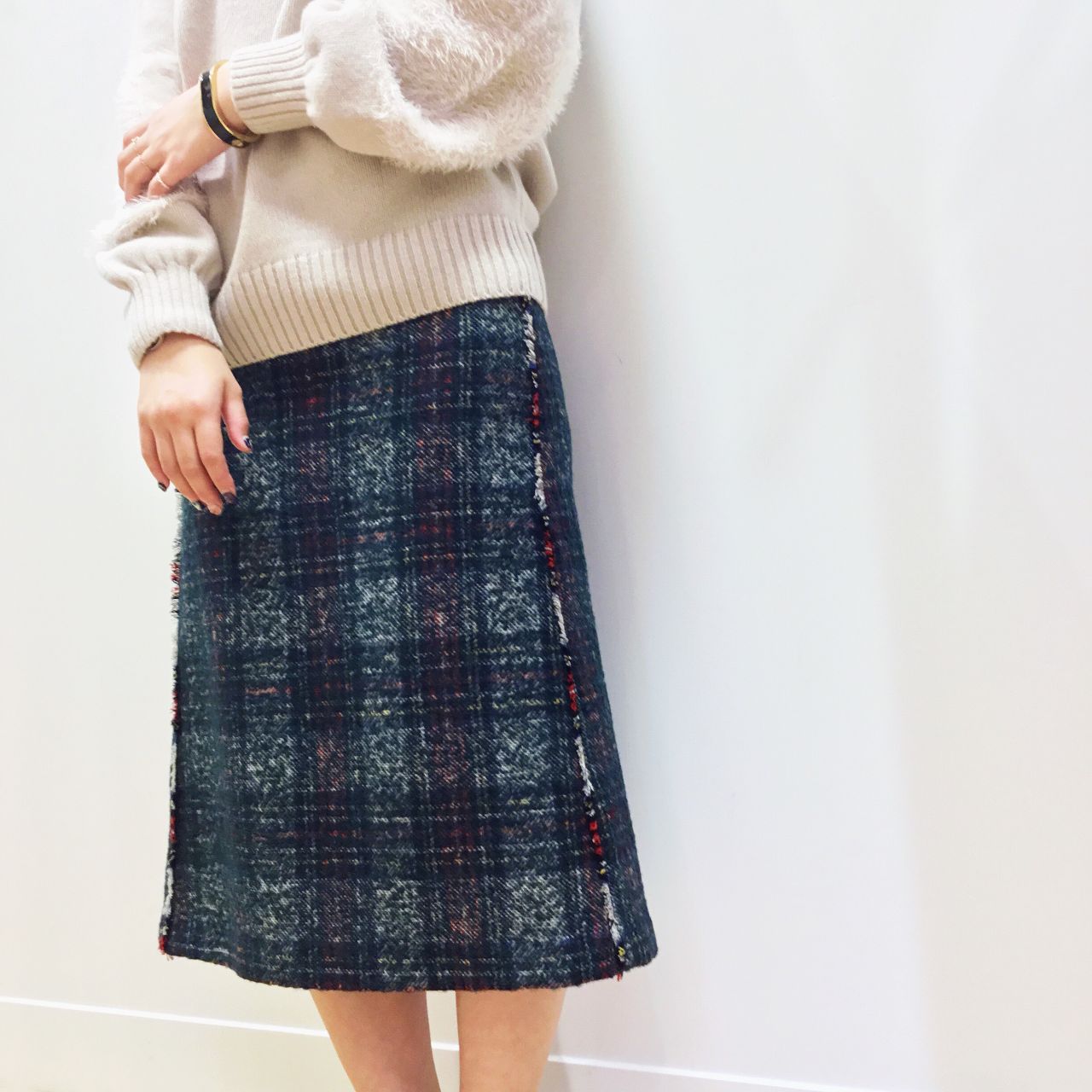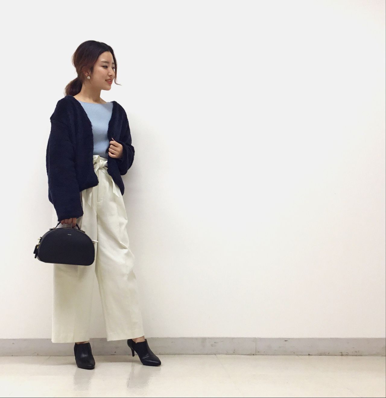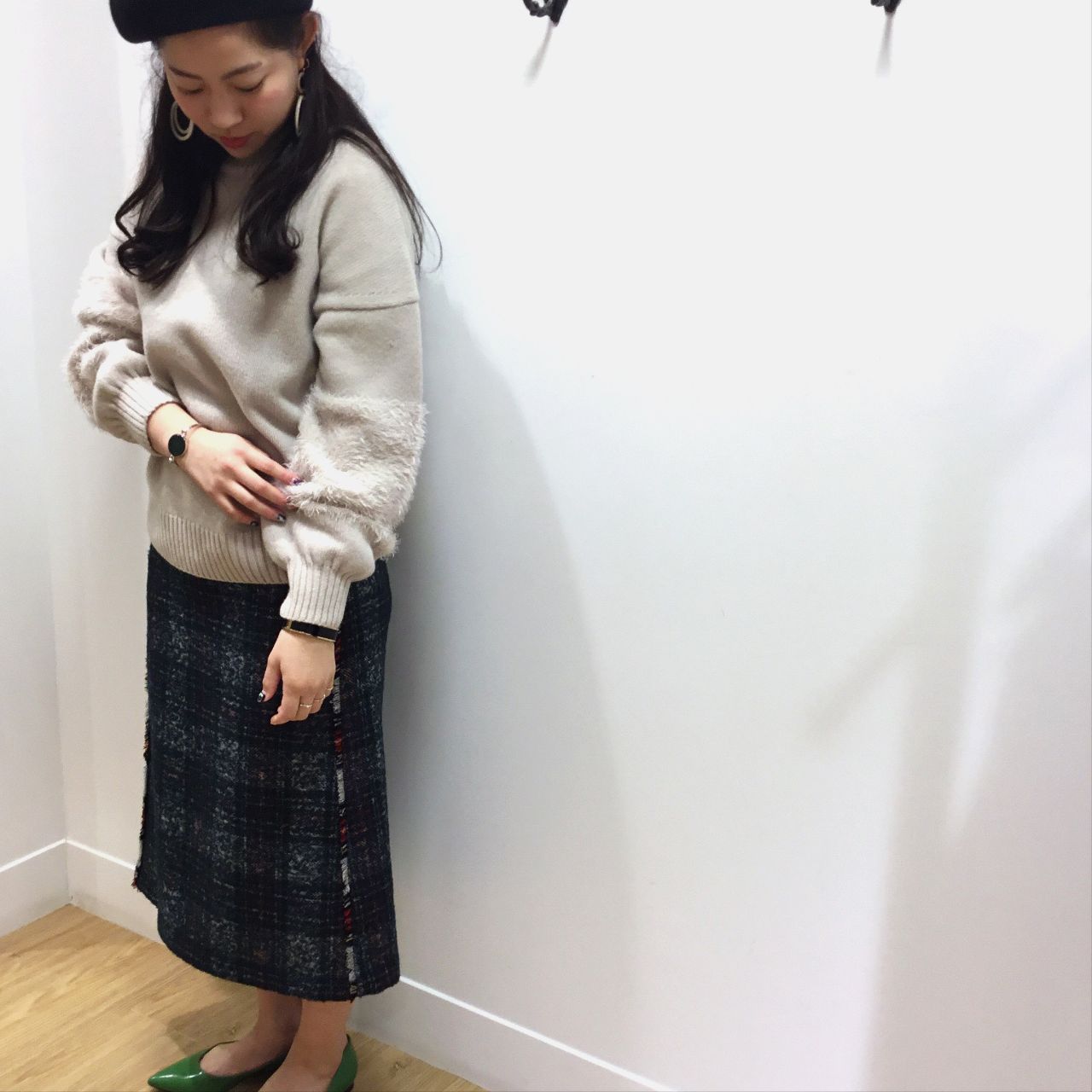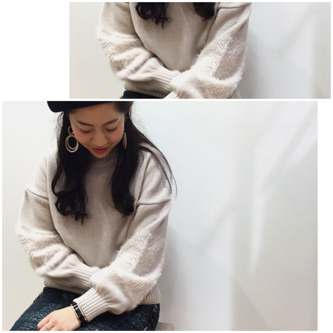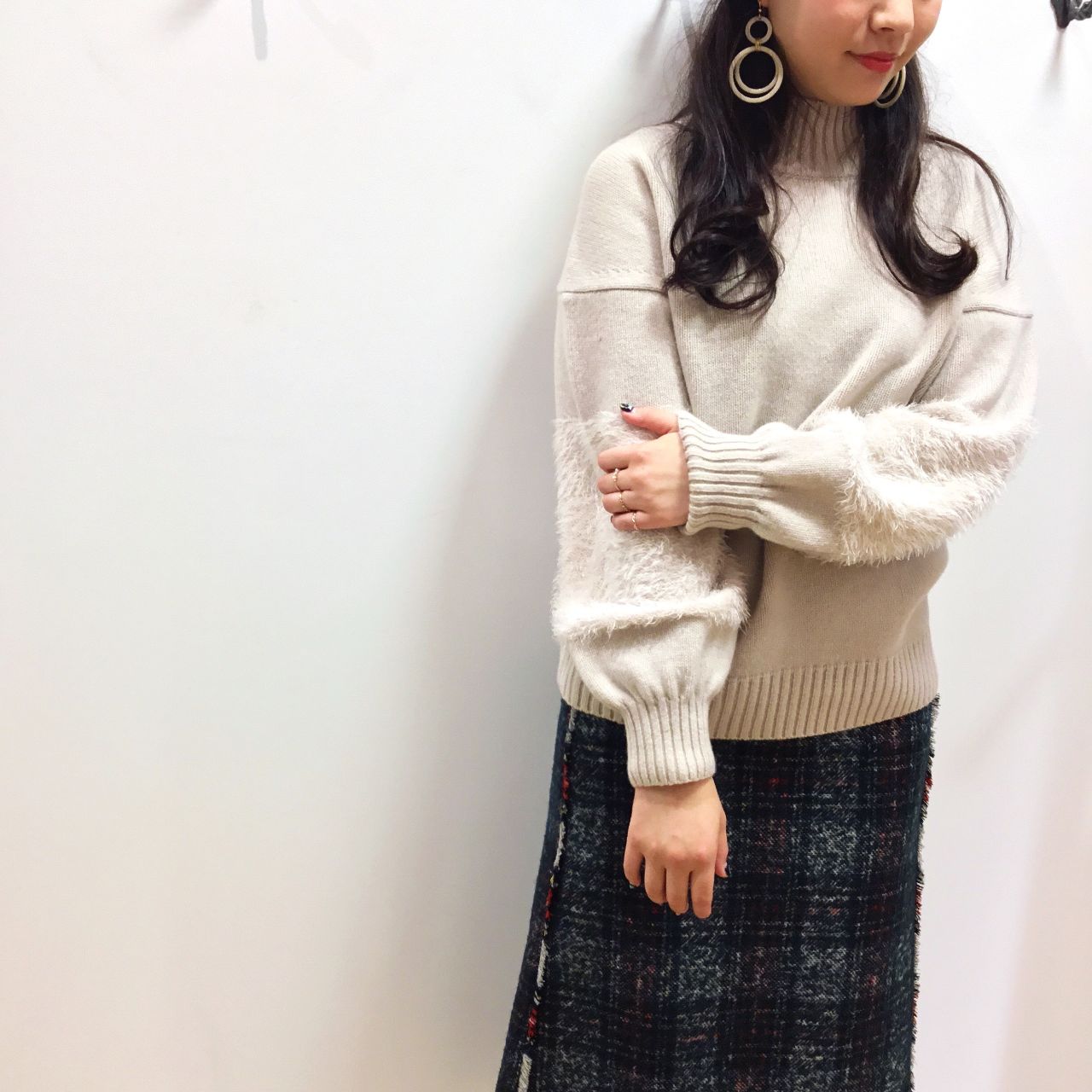 袖がアクセントのニットと合わせて今年のトレンドをプラス。