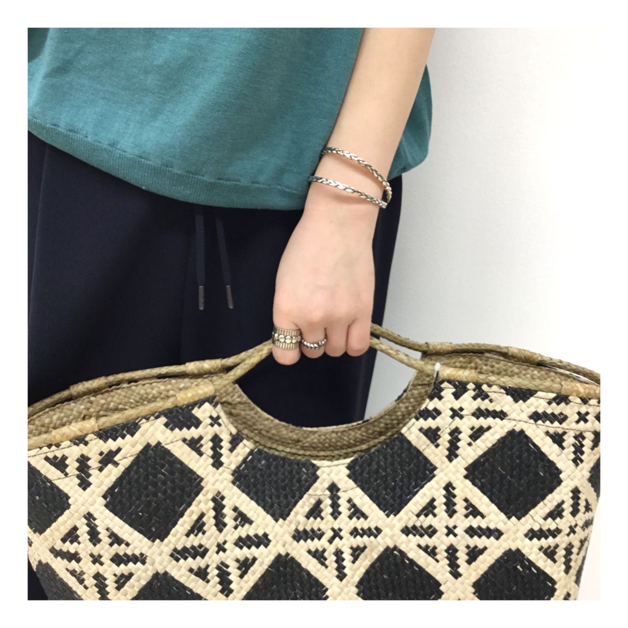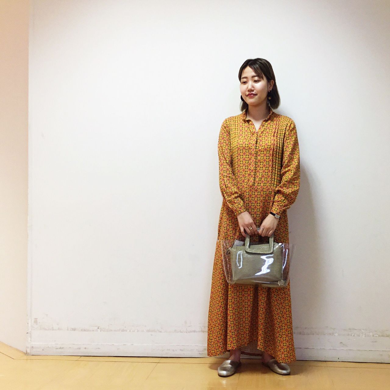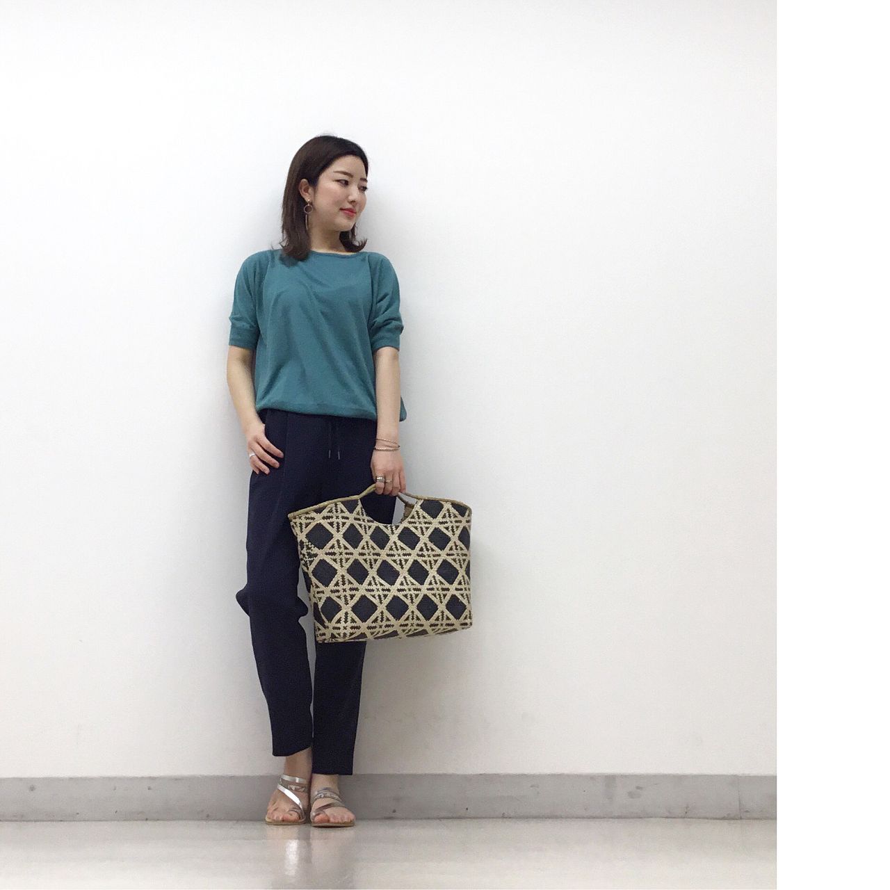 お洋服ではなく小物で柄を足しても◎。