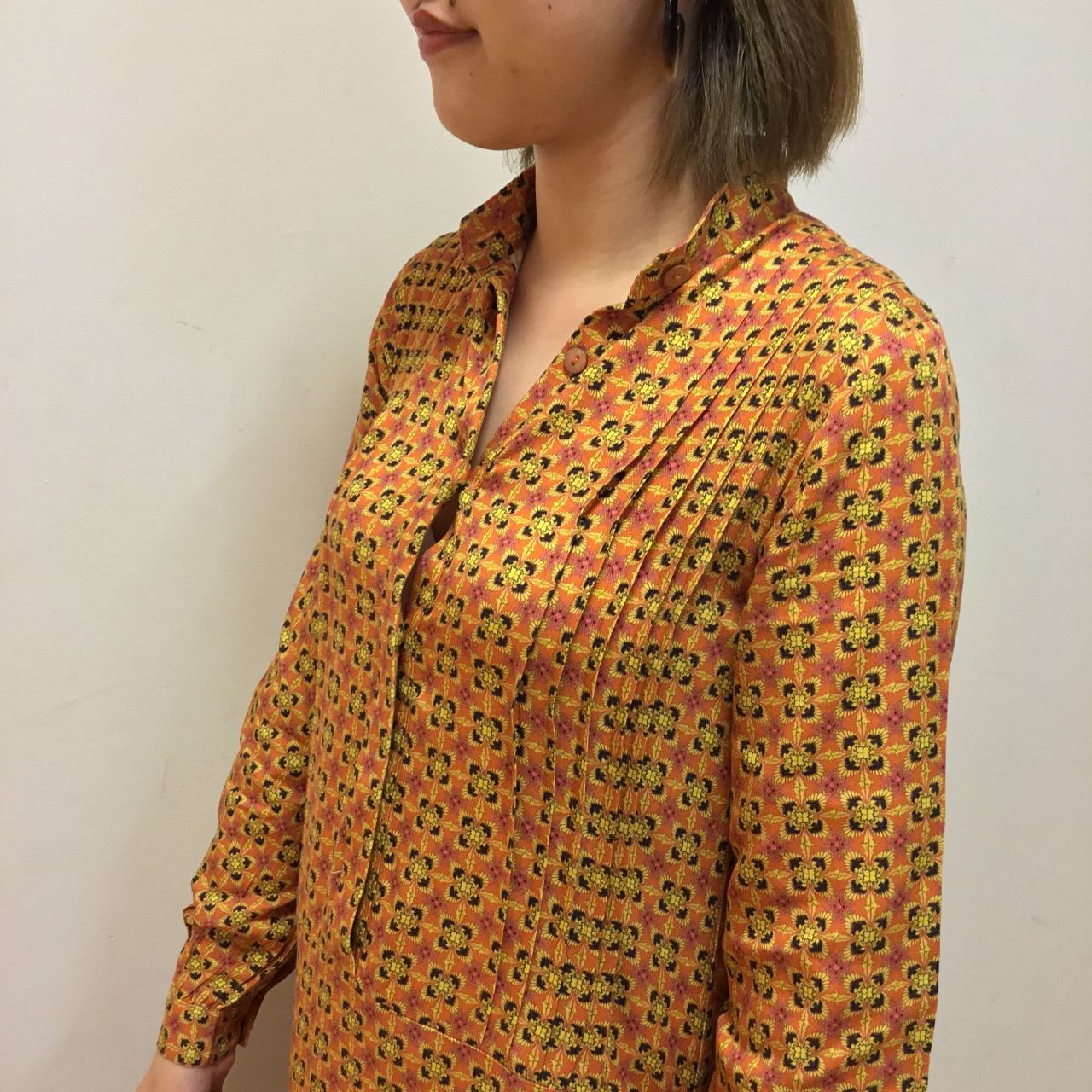 胸元の上品なタックがポイント。