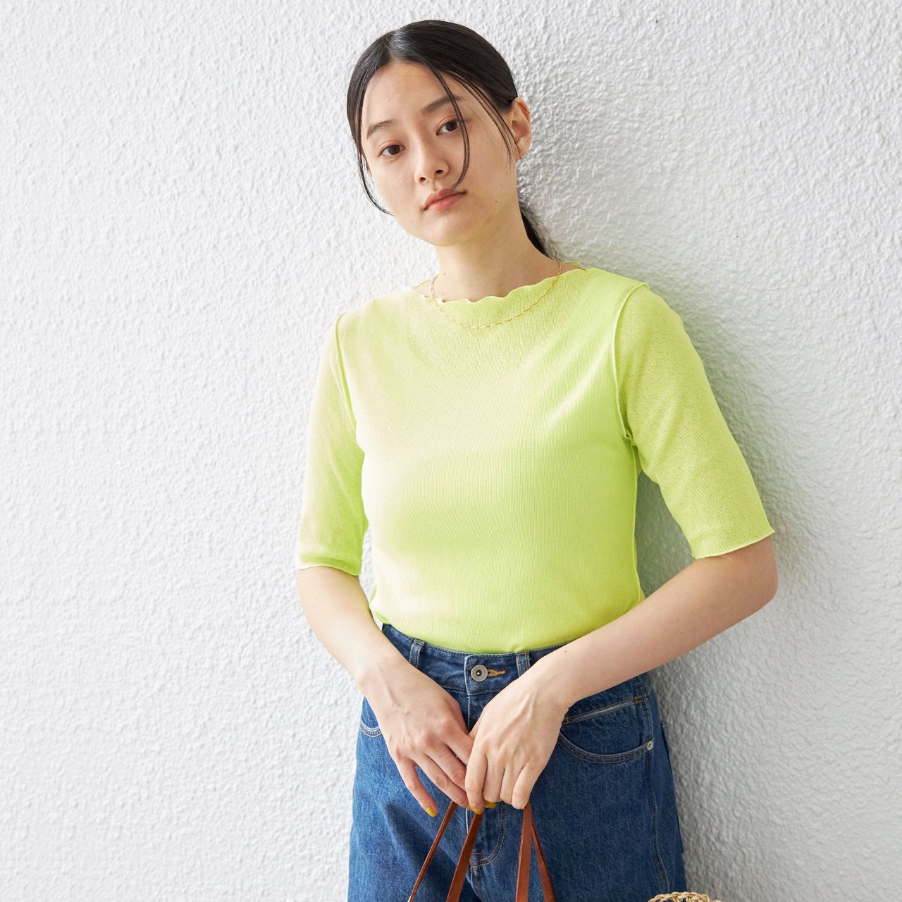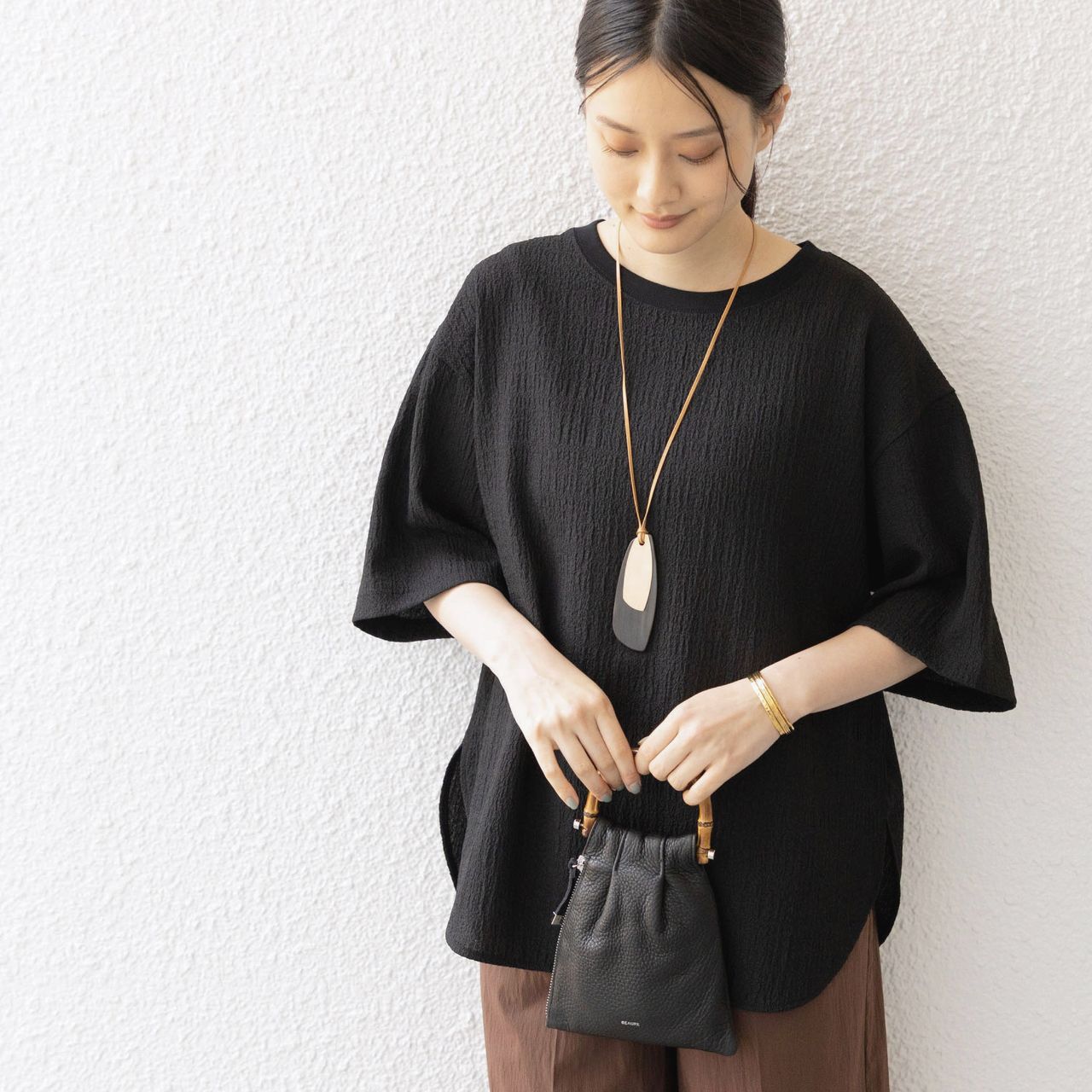 肌離れの良さと、コーディネートに程よい抜け感を演出してくれる一着です。