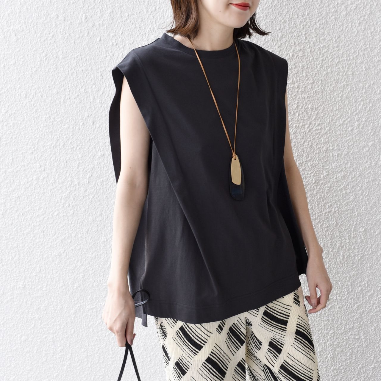 身体のラインを拾わないすっきりとしたシルエットと、脚長に見えるよう幅のバランスにこだわった一着です。