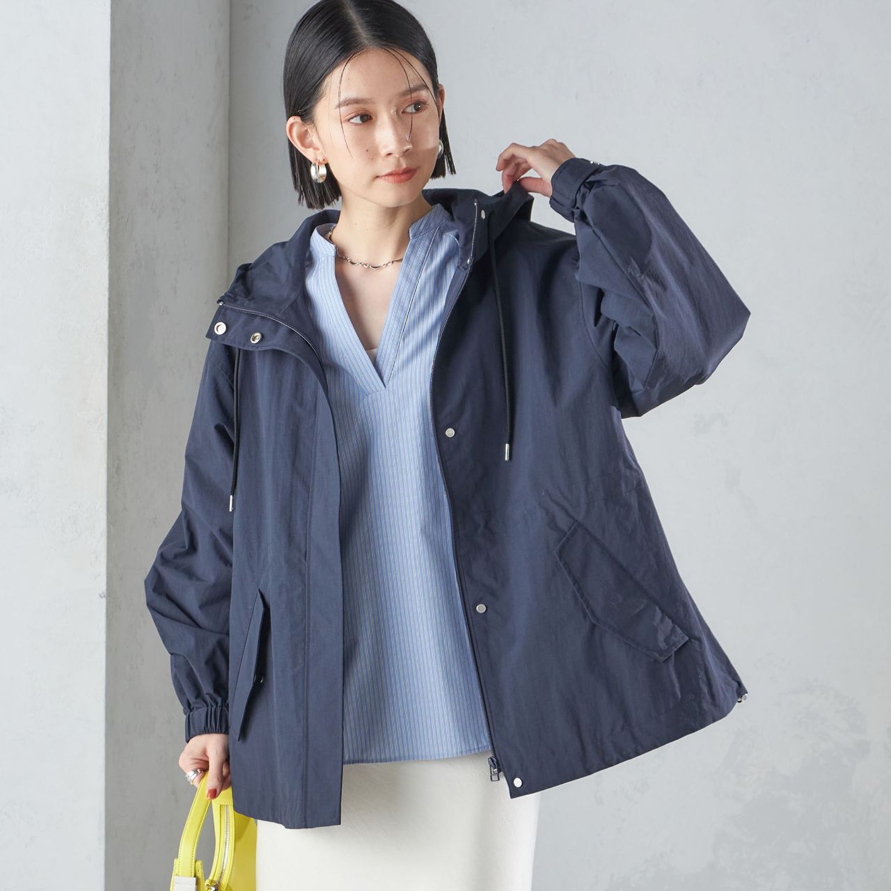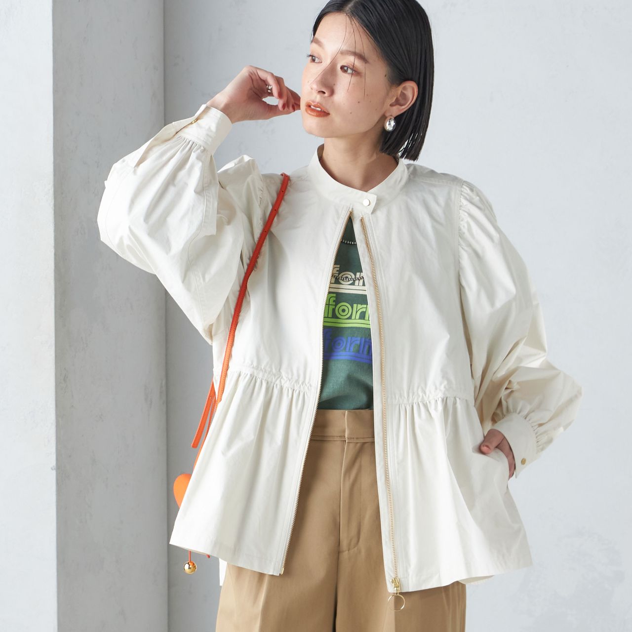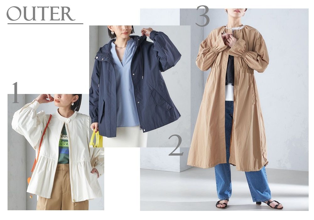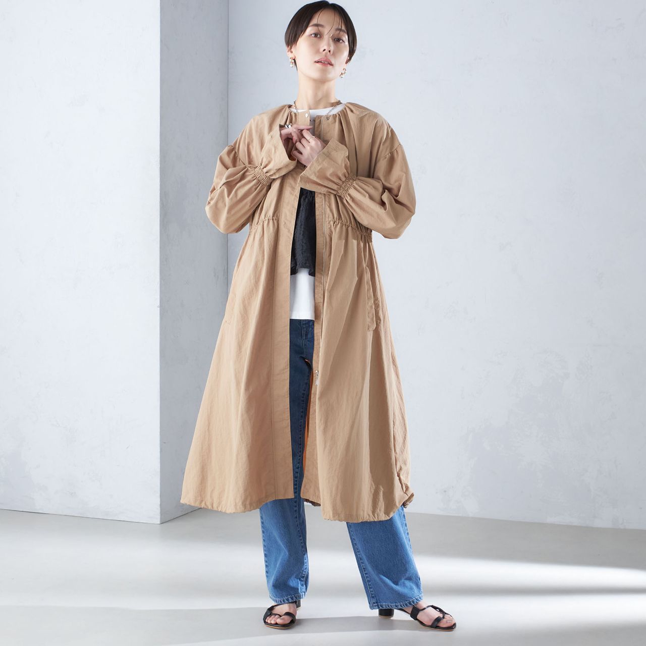 袖口のゴムシャーリング・裾部分のドロストコードなど、こだわりのシルエットで大人カジュアルに着こなせるスプリングコート。